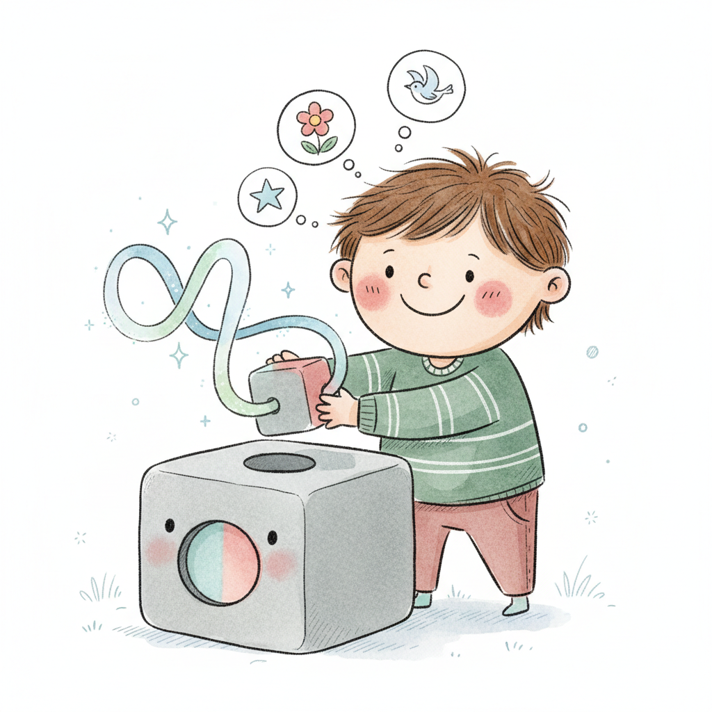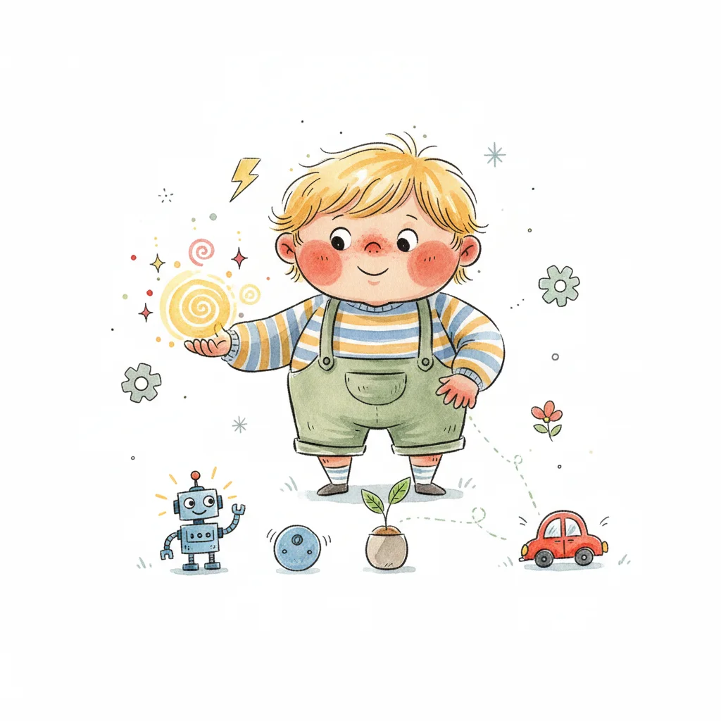 Ein lächelnder Junge spielt mit einem magischen Würfel, der Gedanken wie Blumen und Vögel erzeugt.