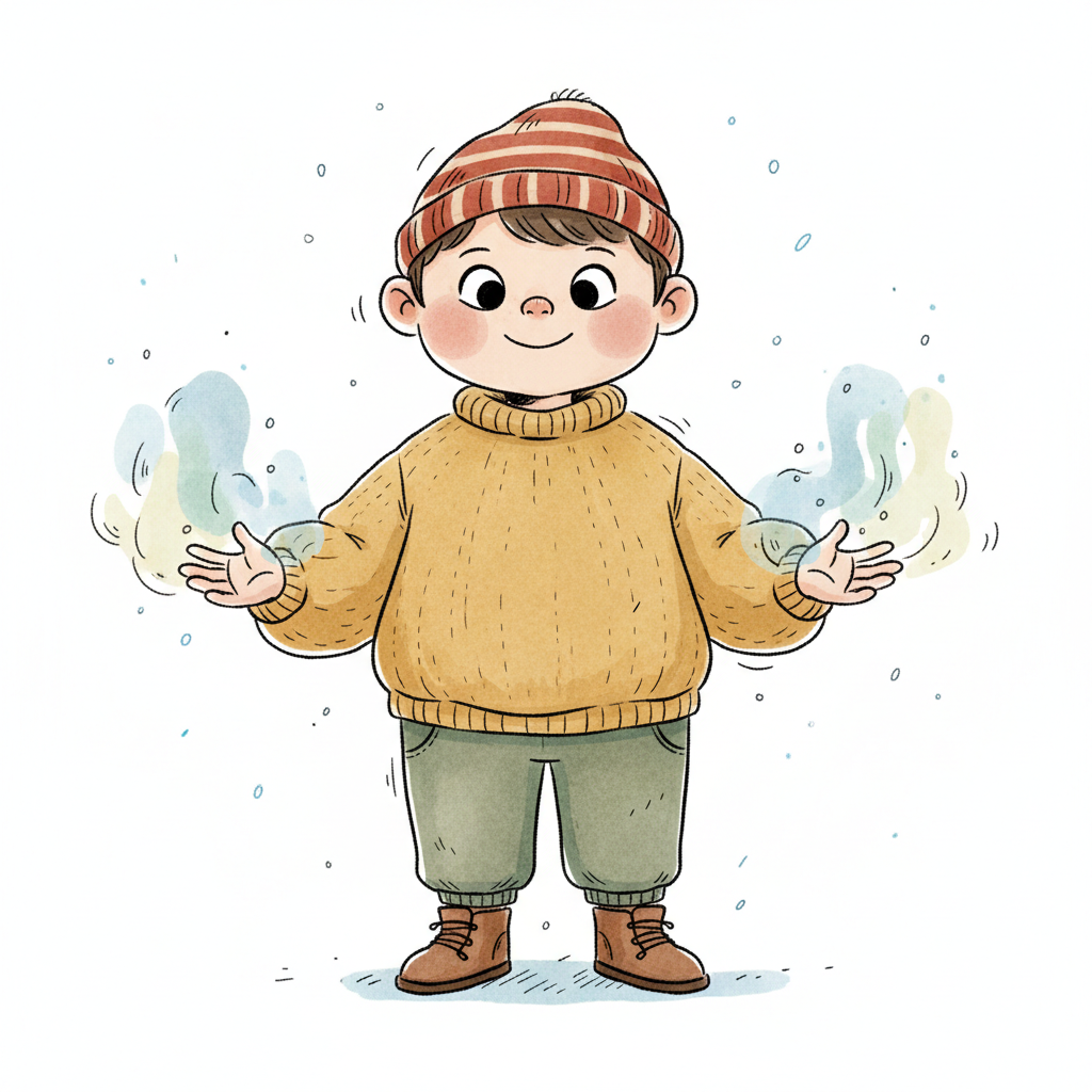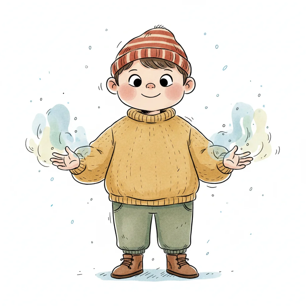 Niedlicher Cartoon-Junge in Winterkleidung mit magischen Händen und Schneeflocken im Hintergrund.