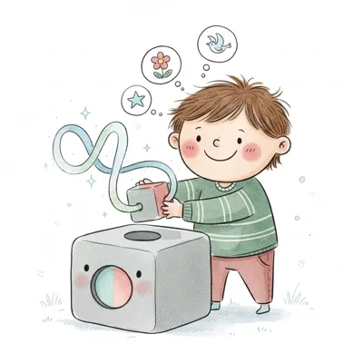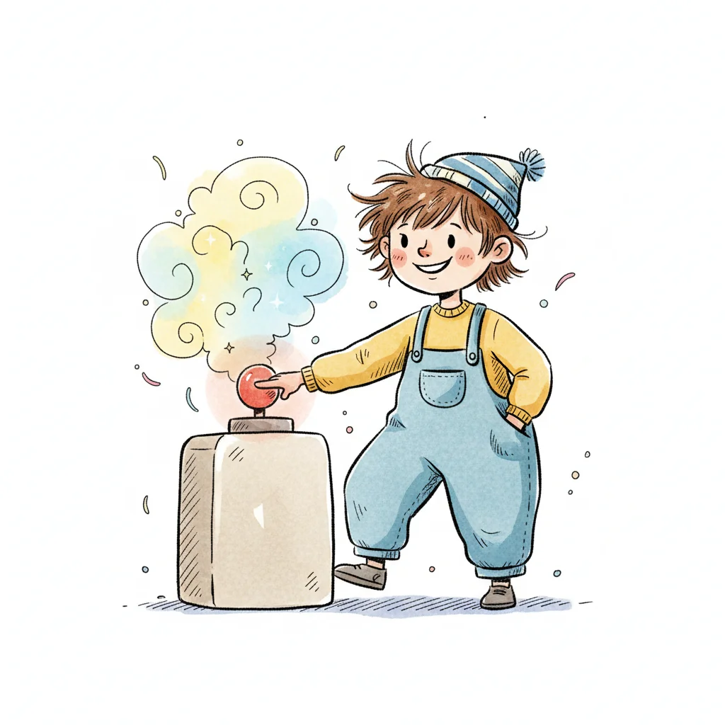 Ein lächelndes Kind drückt einen Knopf, aus dem bunte, magische Wolken aufsteigen.