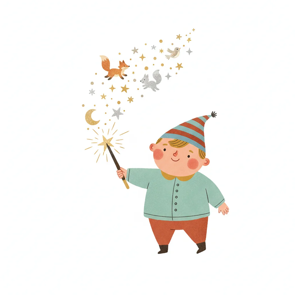 Niedlicher Gnom zaubert Sterne, Mond und Tiere mit einem Zauberstab.