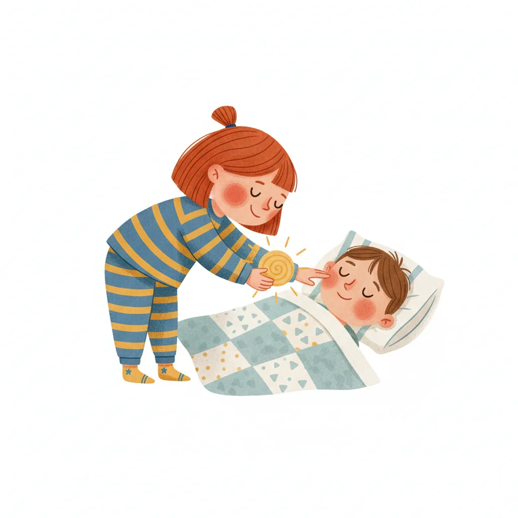 Ein Mädchen weckt einen schlafenden Jungen sanft mit einem leuchtenden, magischen Gegenstand.