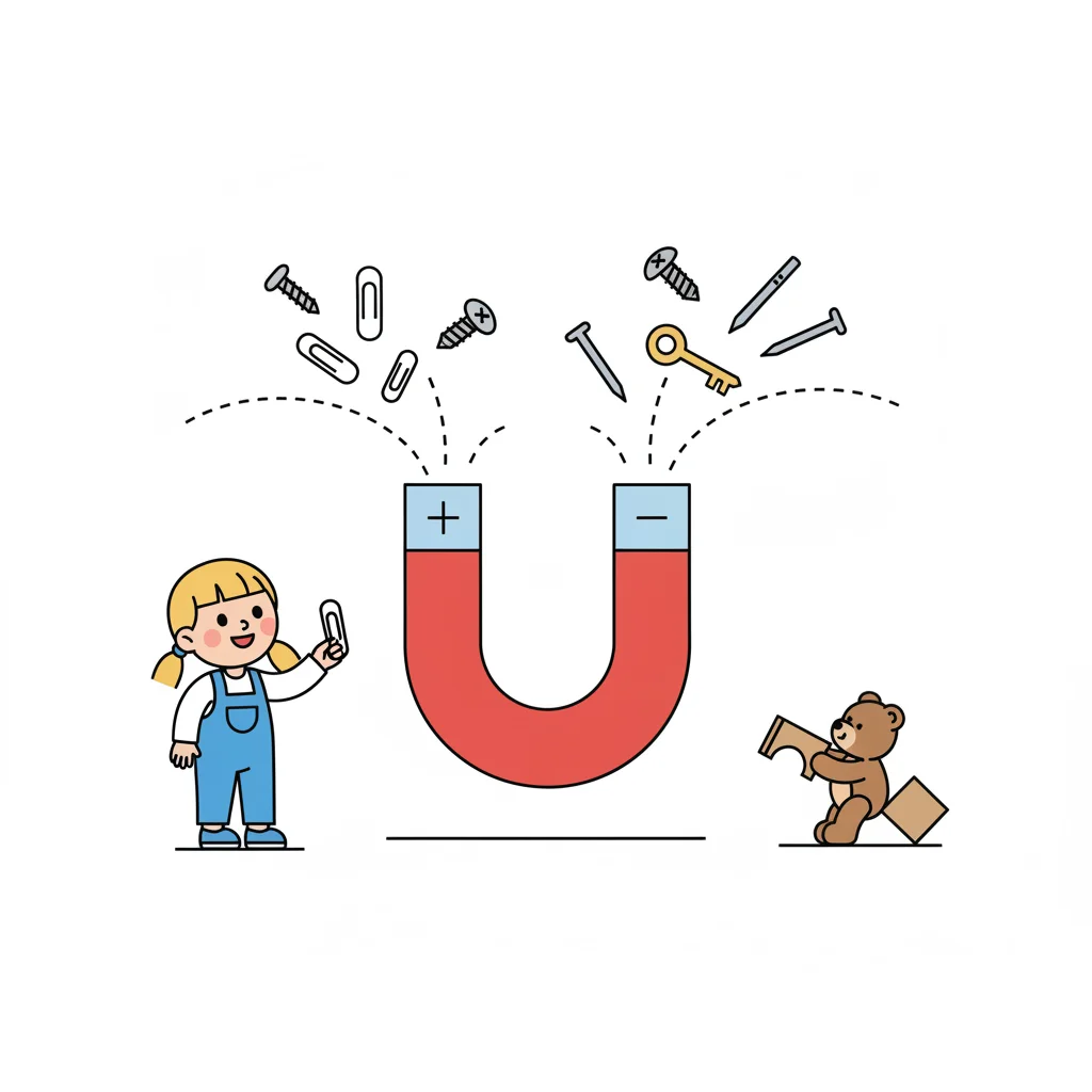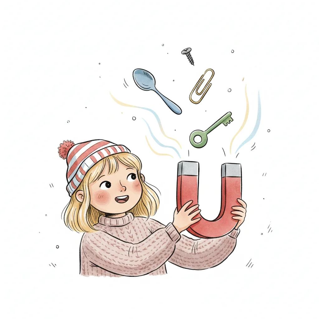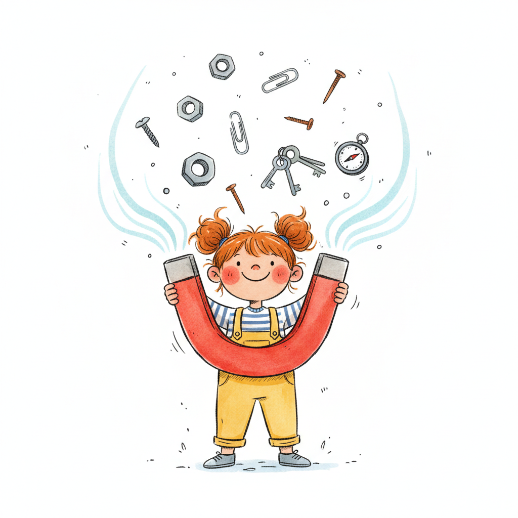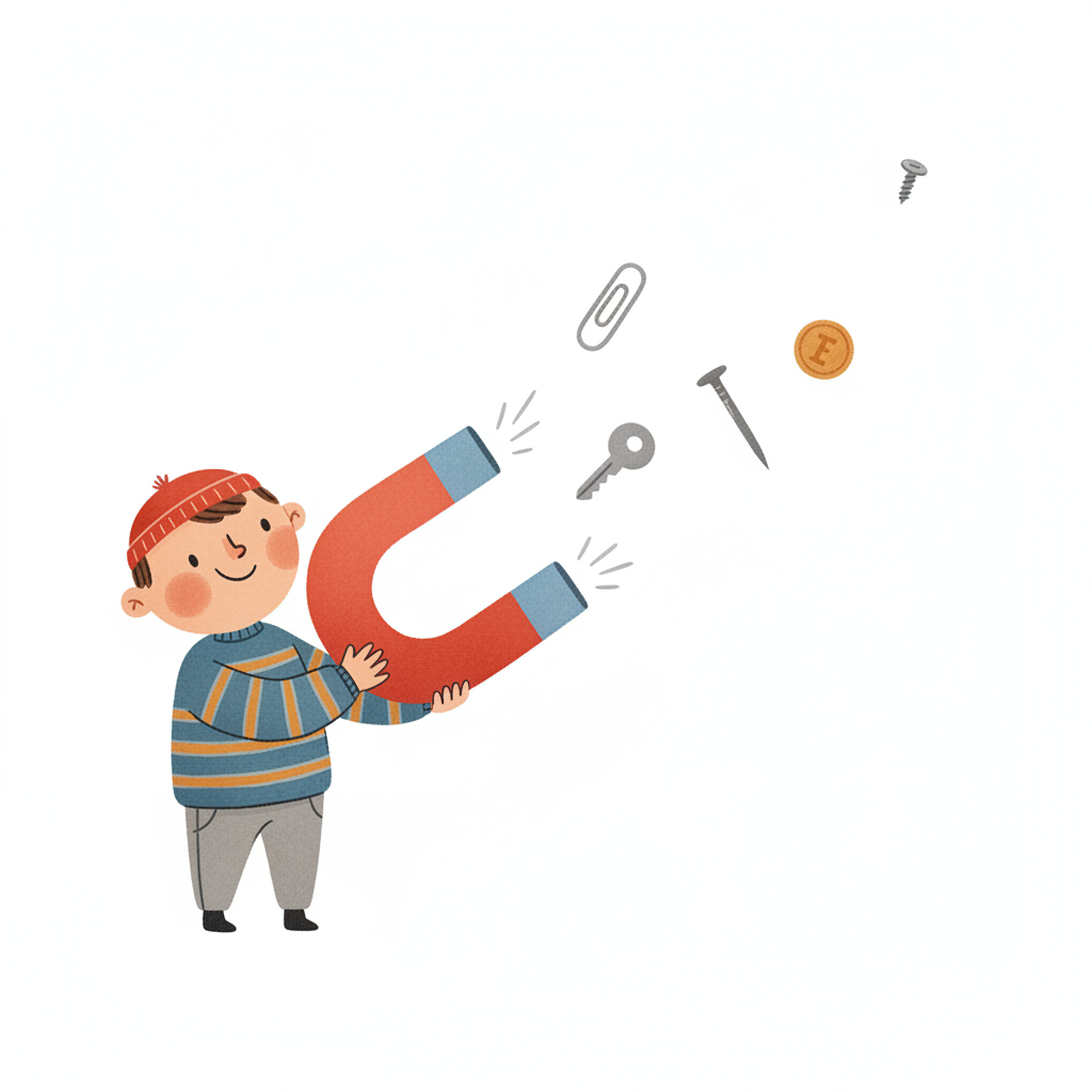 Illustration eines Jungen mit Hufeisenmagnet, der Metallobjekte wie Schrauben und Büroklammern anzieht.