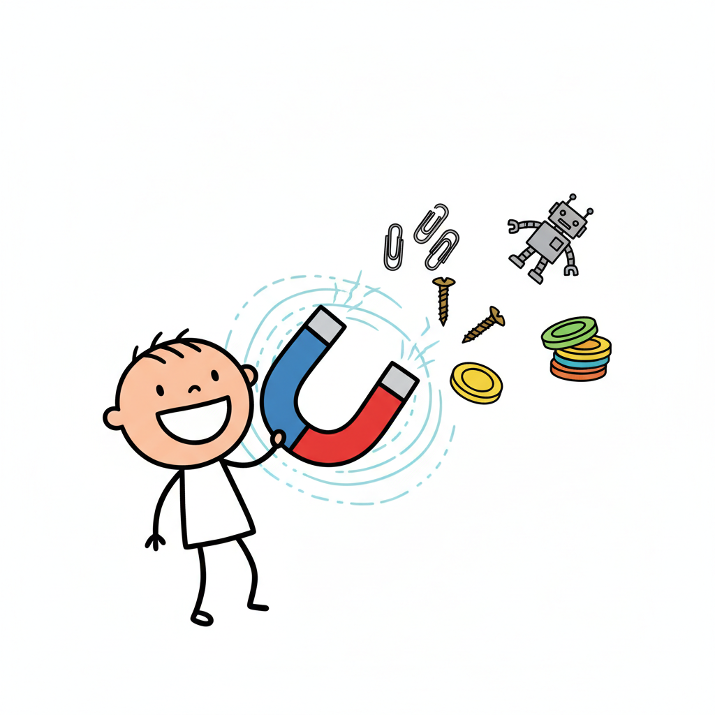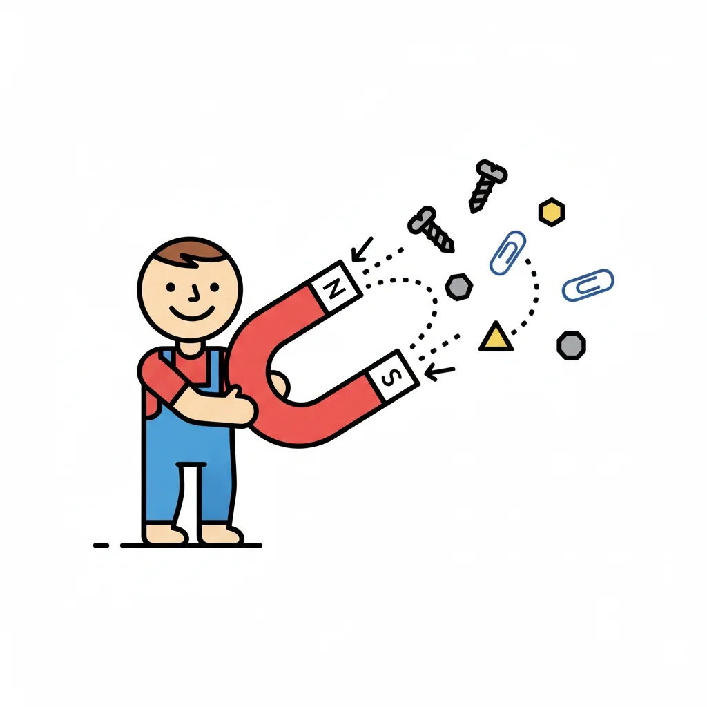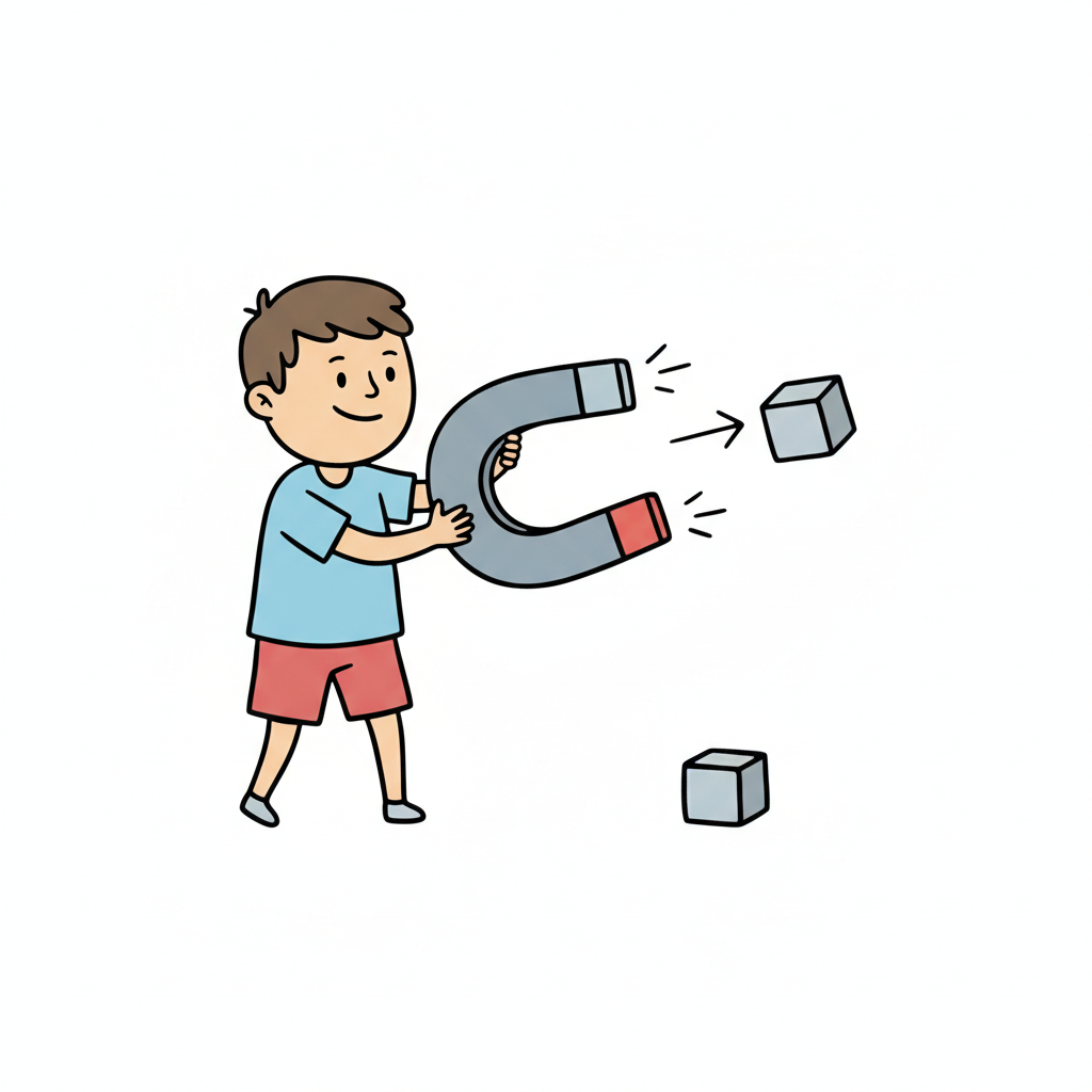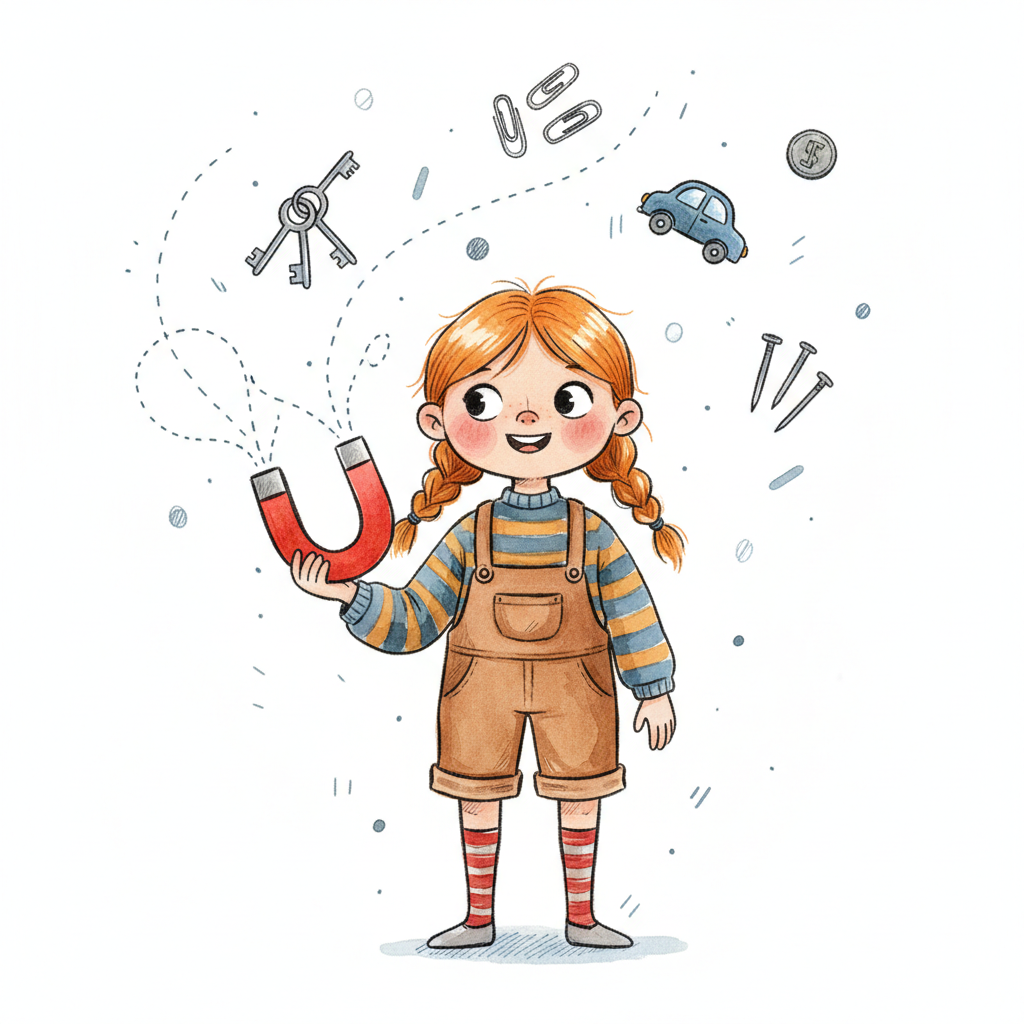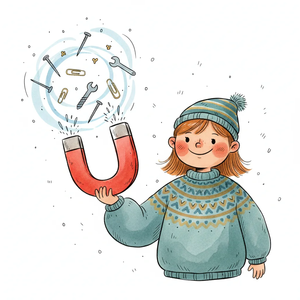 Illustration eines Jungen mit Hufeisenmagnet, der Metallobjekte wie Schrauben und Büroklammern anzieht.