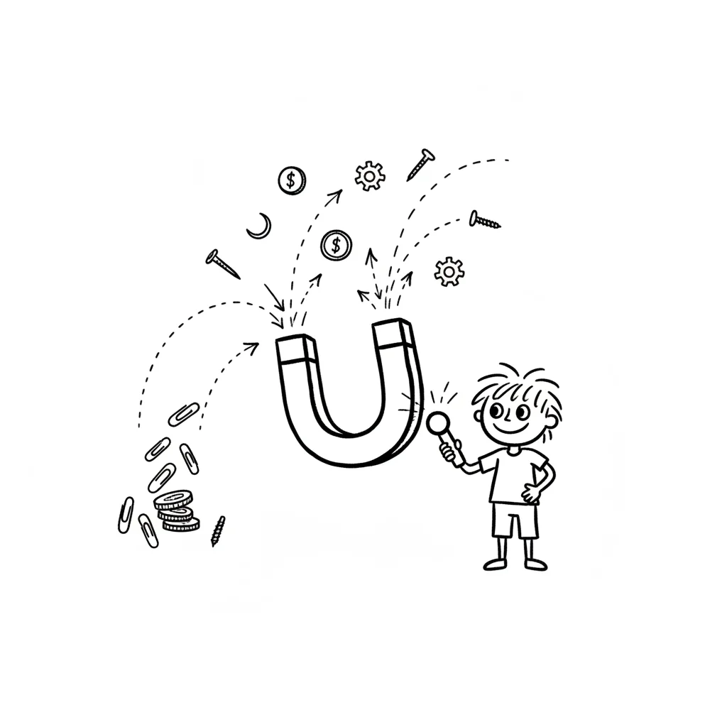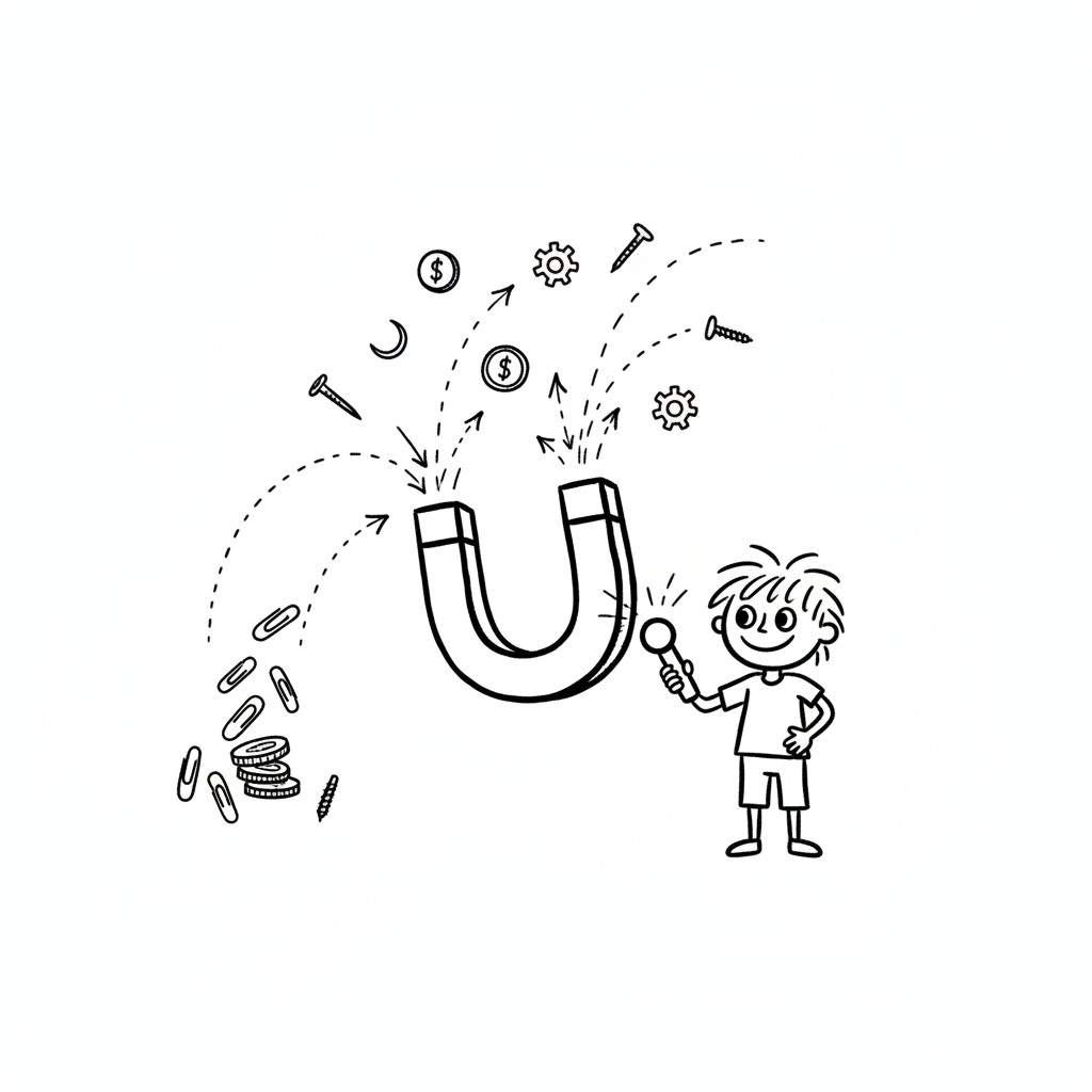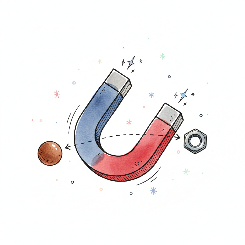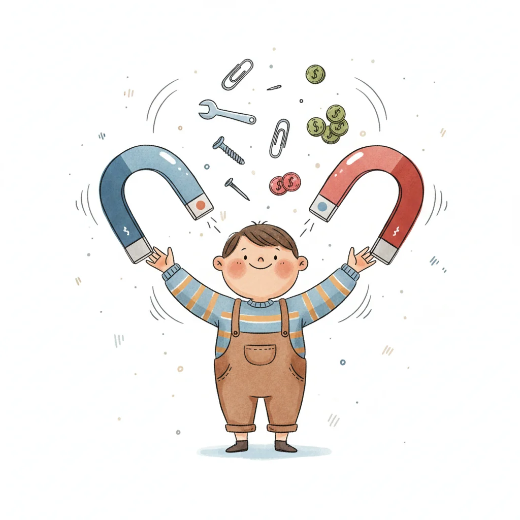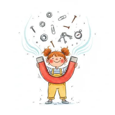 Illustration eines Jungen mit Hufeisenmagnet, der Metallobjekte wie Schrauben und Büroklammern anzieht.