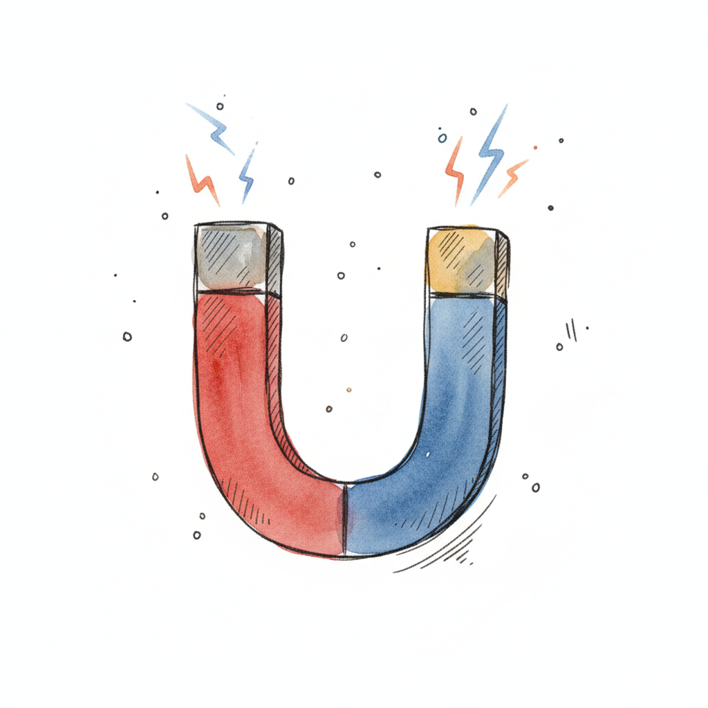 Illustration eines rot-blauen Hufeisenmagneten mit Blitzen, die Magnetismus andeuten.