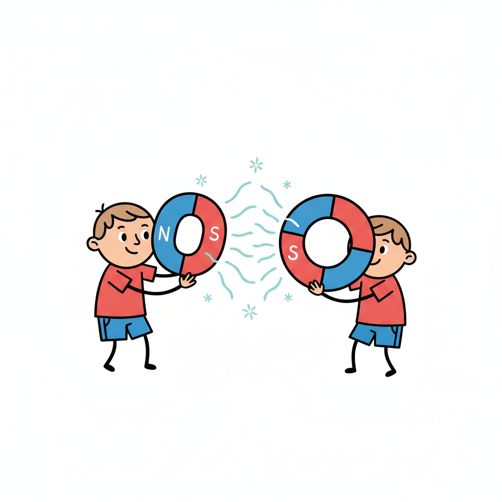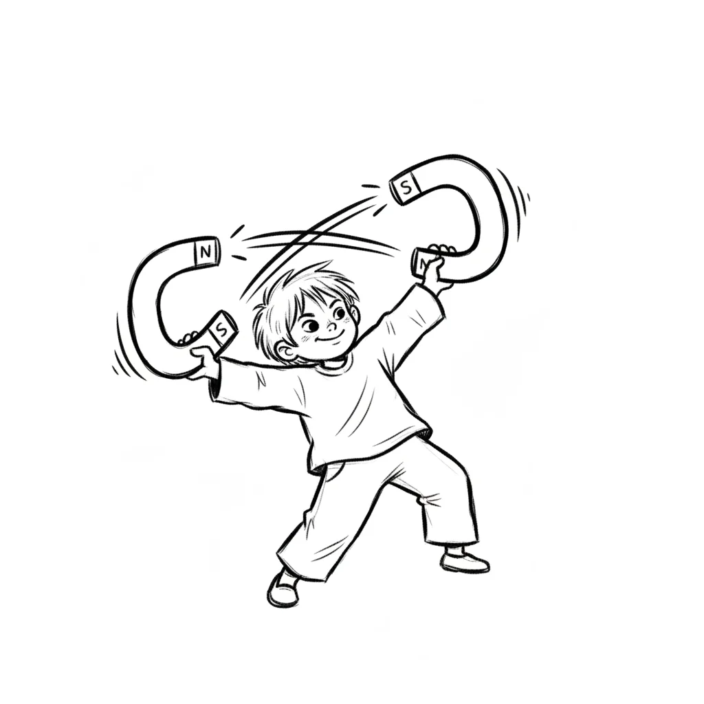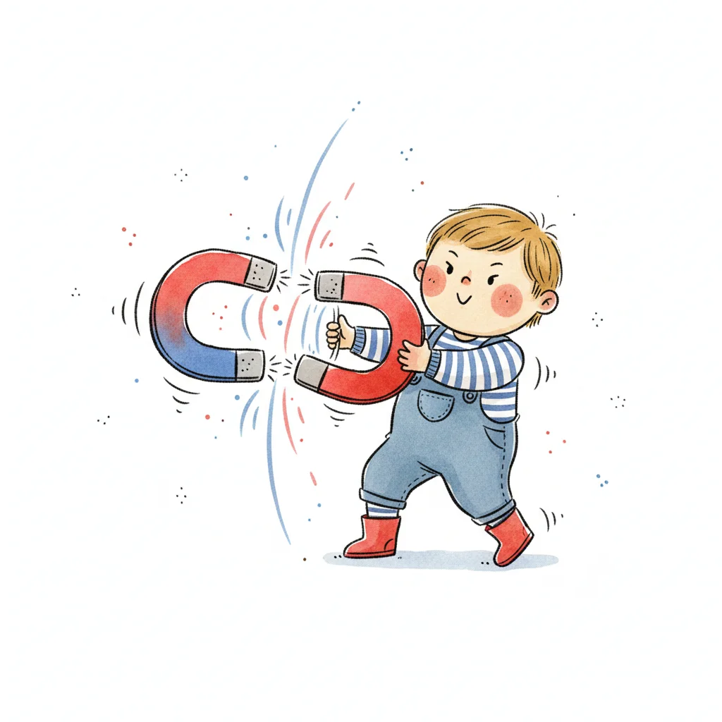 Ein fröhlicher Junge spielt mit zwei Hufeisenmagneten, die sich mit bunten Kräften anziehen.