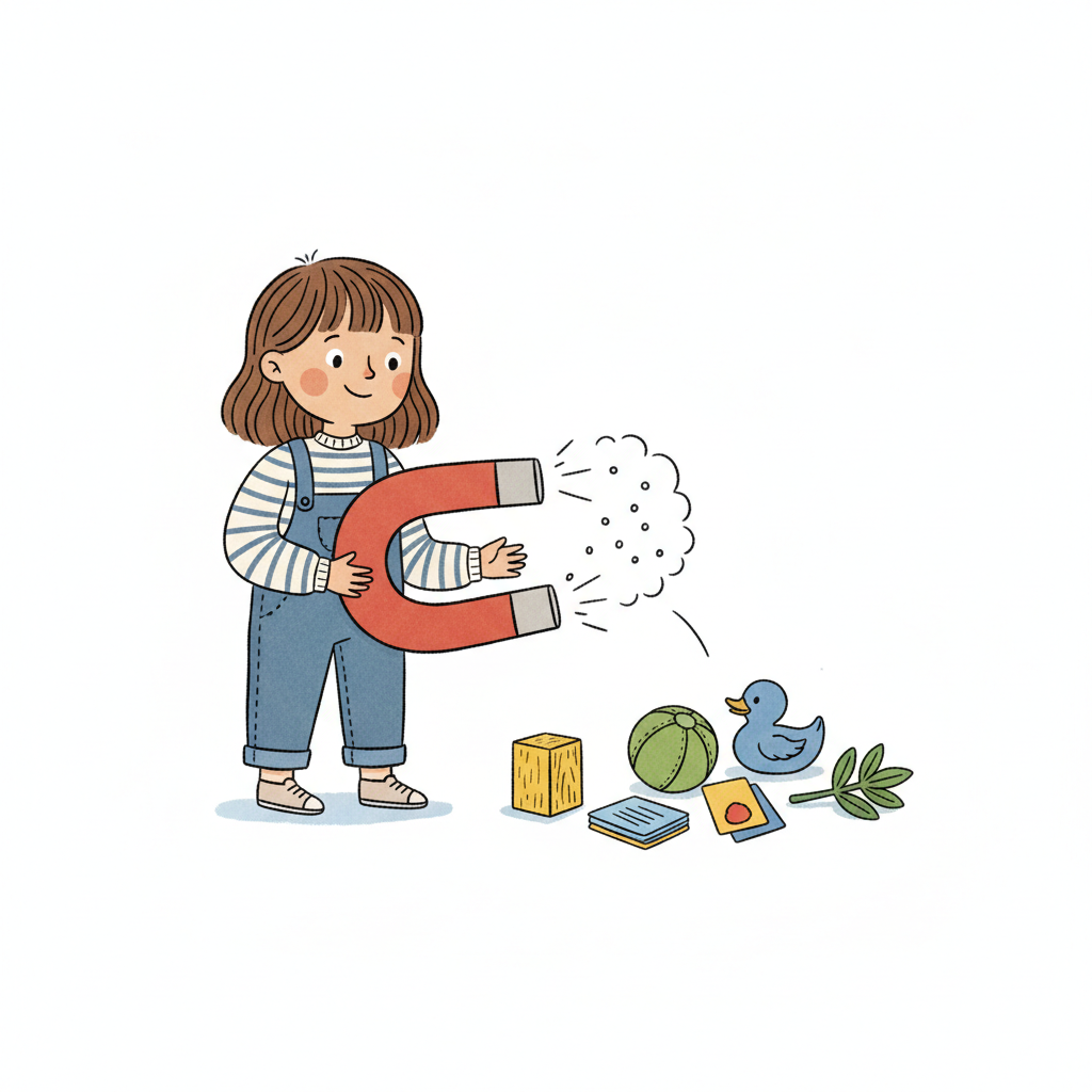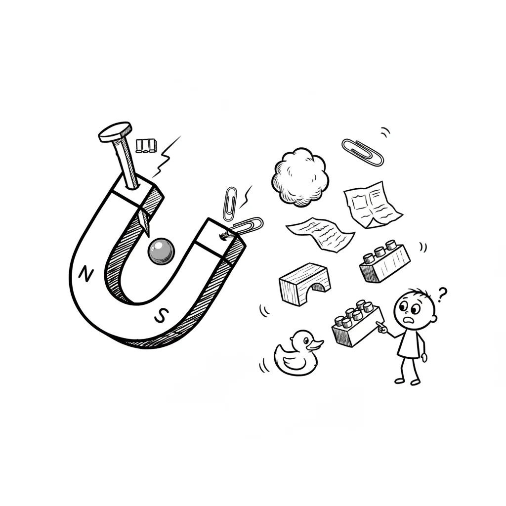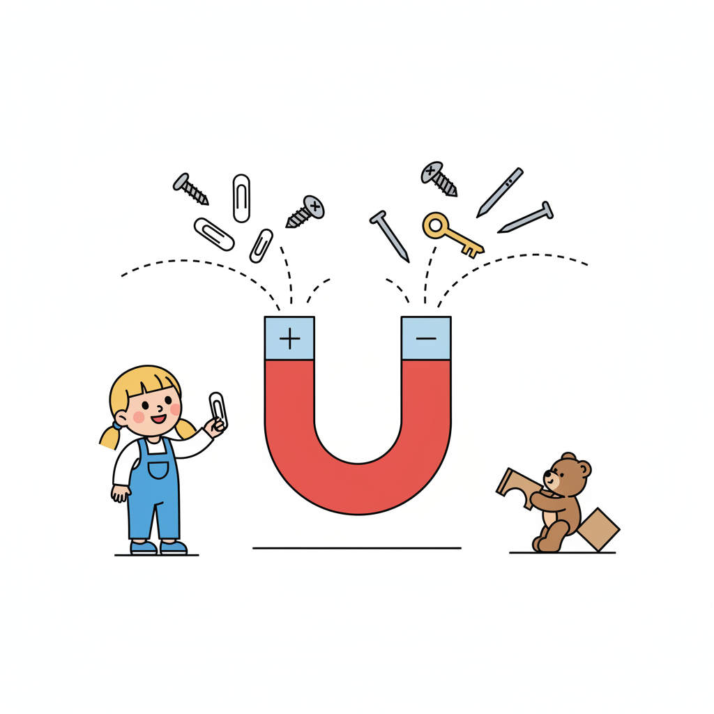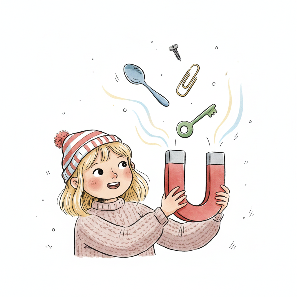 Magnetismus: Ein Hufeisenmagnet zieht Metall an, während ein Kind nicht-magnetische Dinge betrachtet.