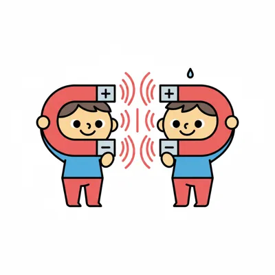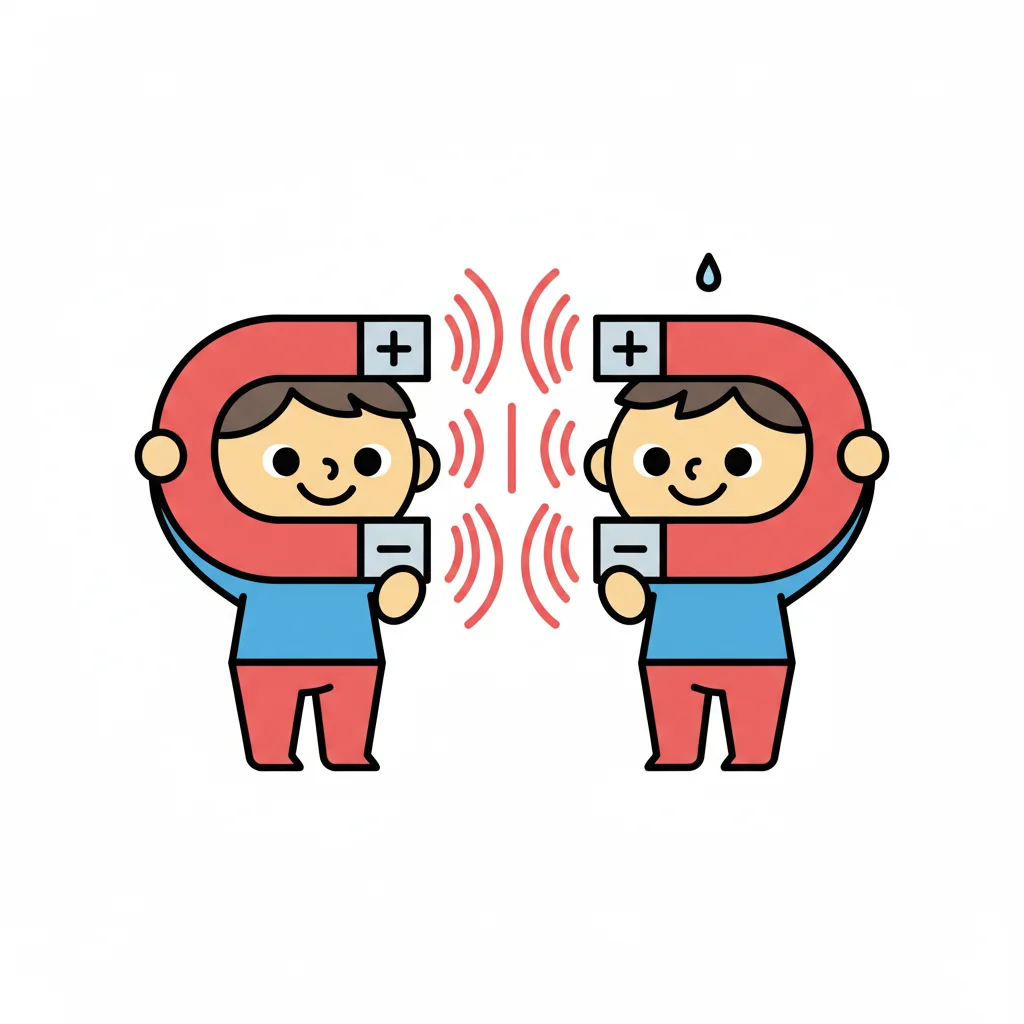 Zwei Comicfiguren halten Magnete mit gleichen Polen, die sich abstoßen. Eine Figur schwitzt.