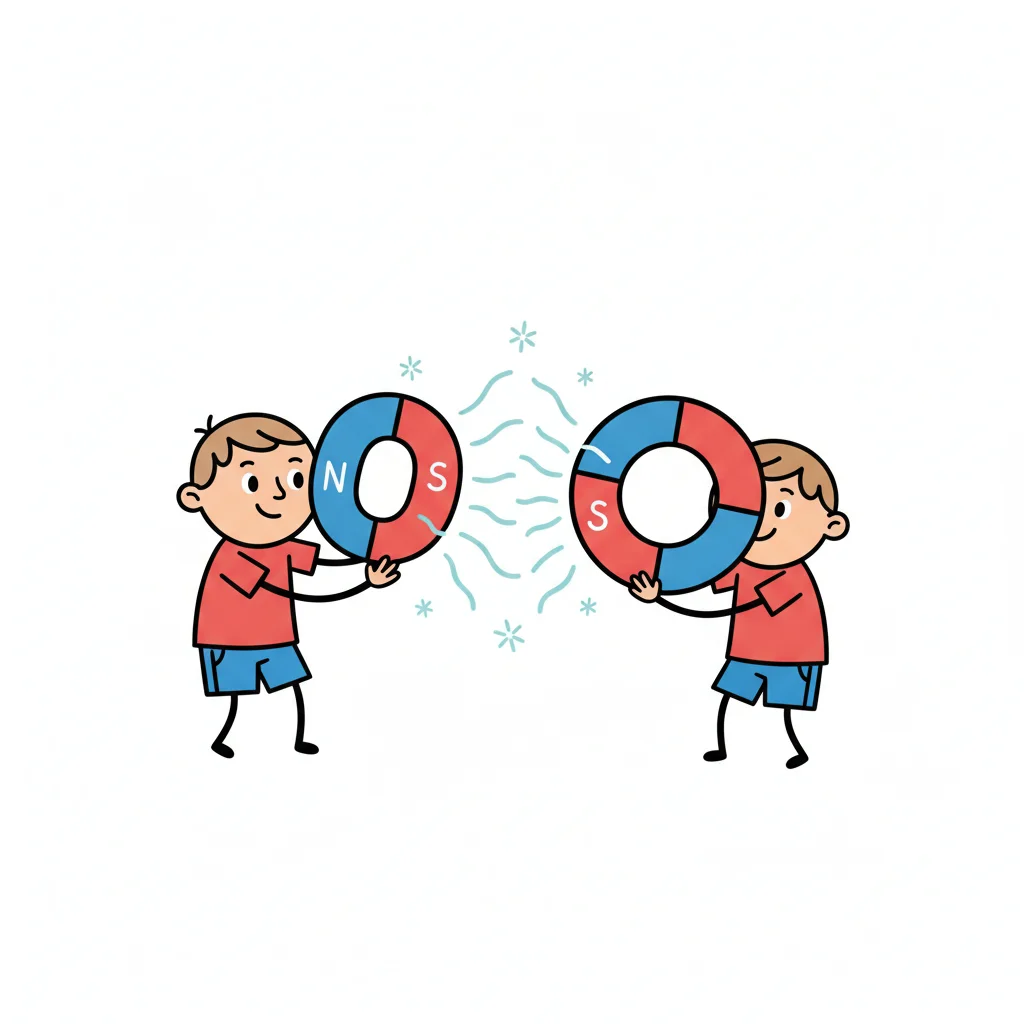 Zwei Jungen halten Ringmagnete, deren ungleiche Pole (N und S) sich anziehen.