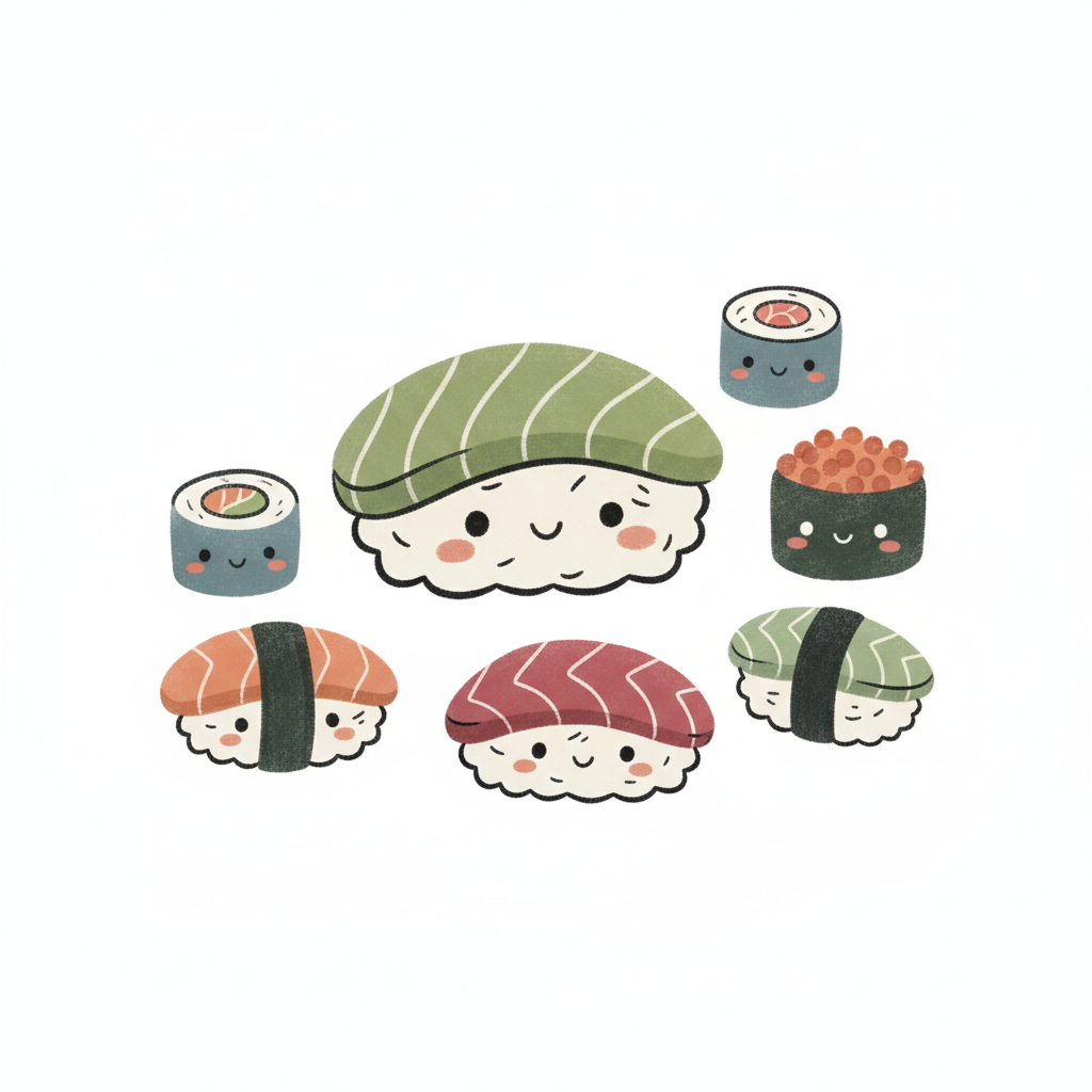 Kawaii-Sushi-Illustration mit lächelnden Nigiri, Maki und Gunkan auf weißem Grund.