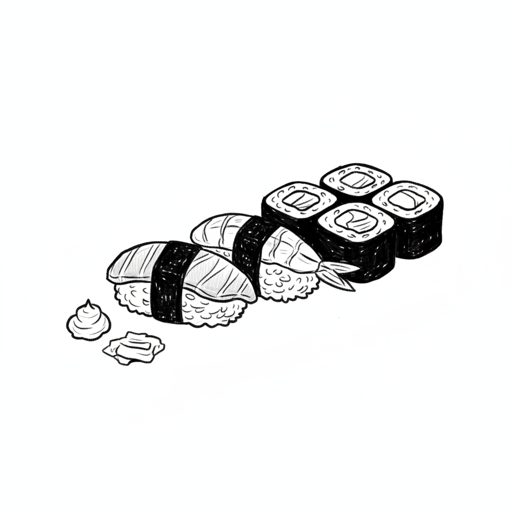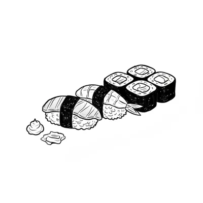 Schwarz-weiße Skizze von Sushi: Nigiri, Maki, Wasabi und Ingwer auf weißem Hintergrund.