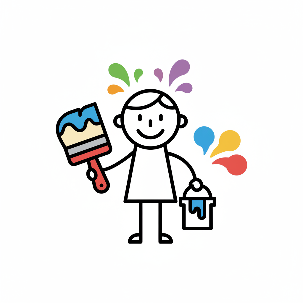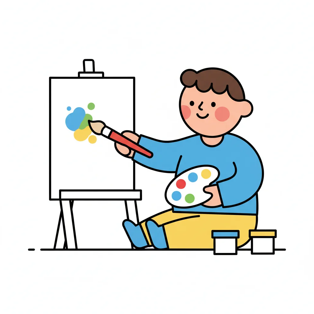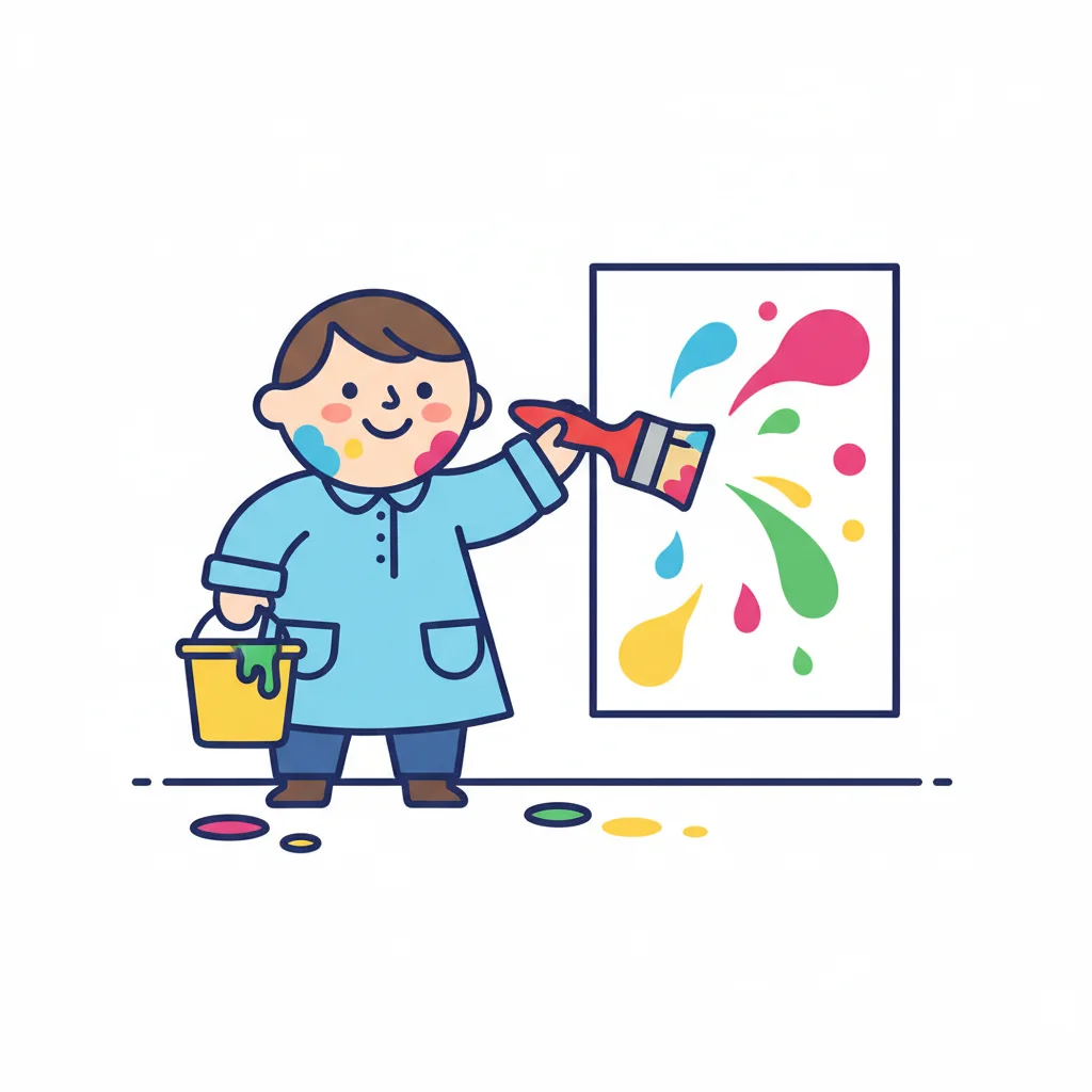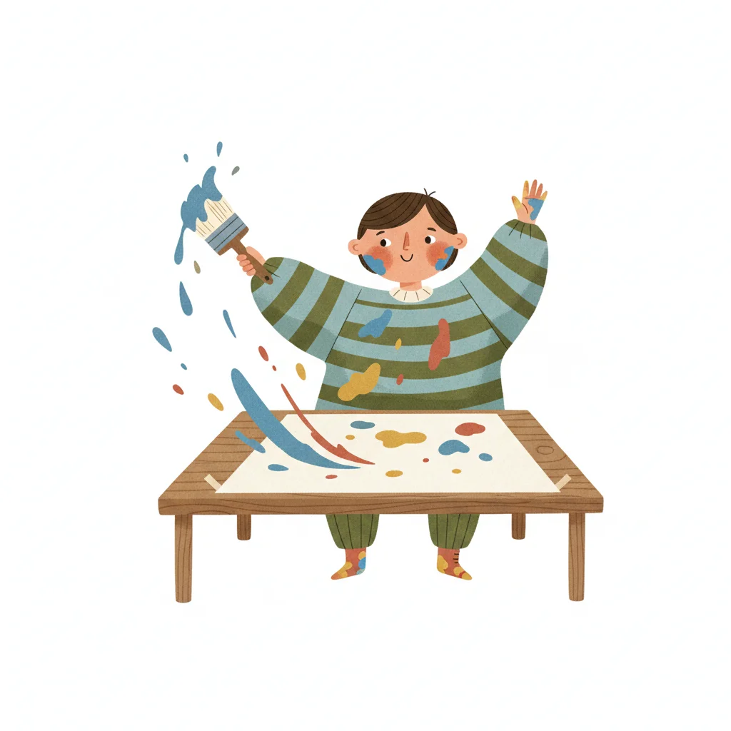 Ein fröhliches Kind malt mit Pinsel und Farbtöpfen.