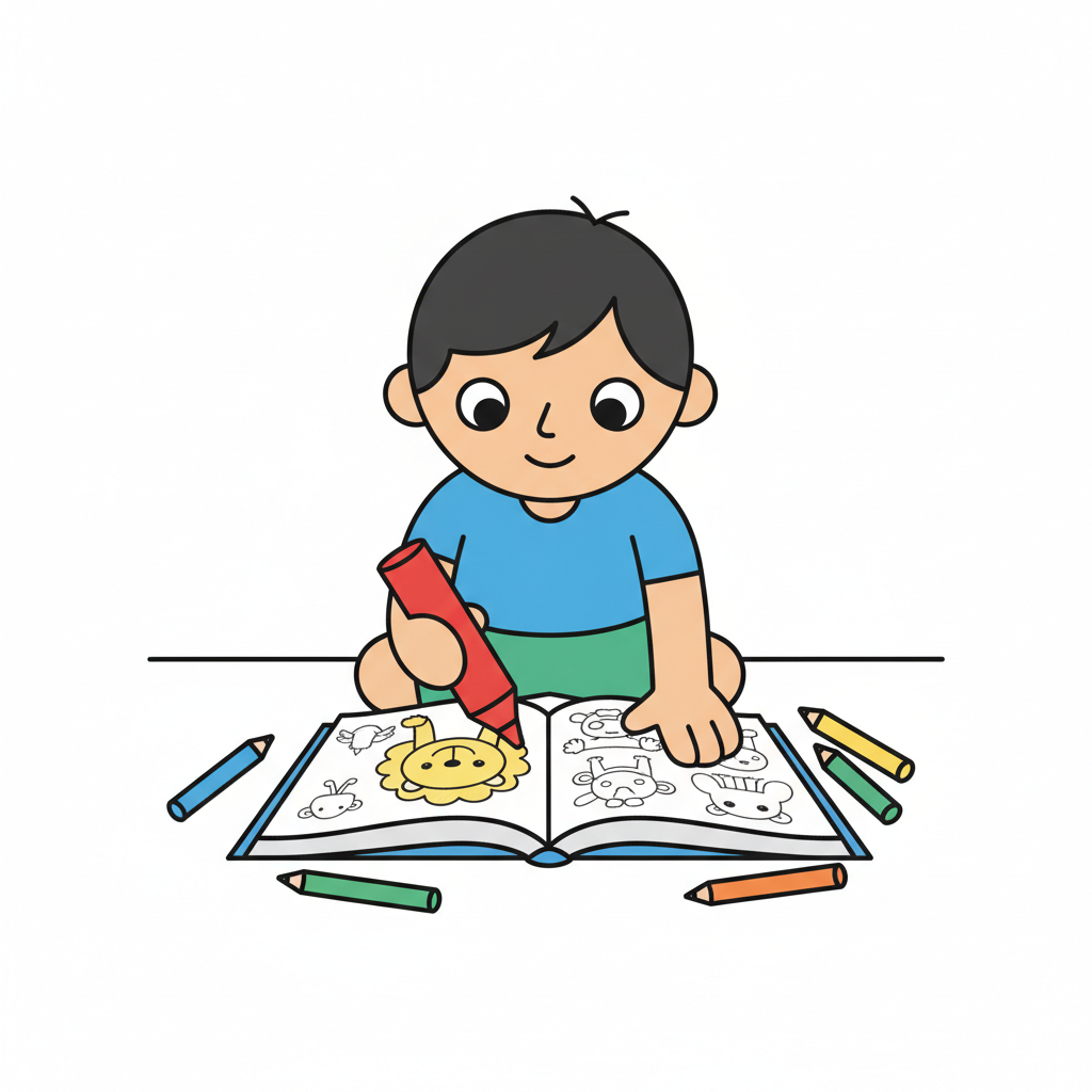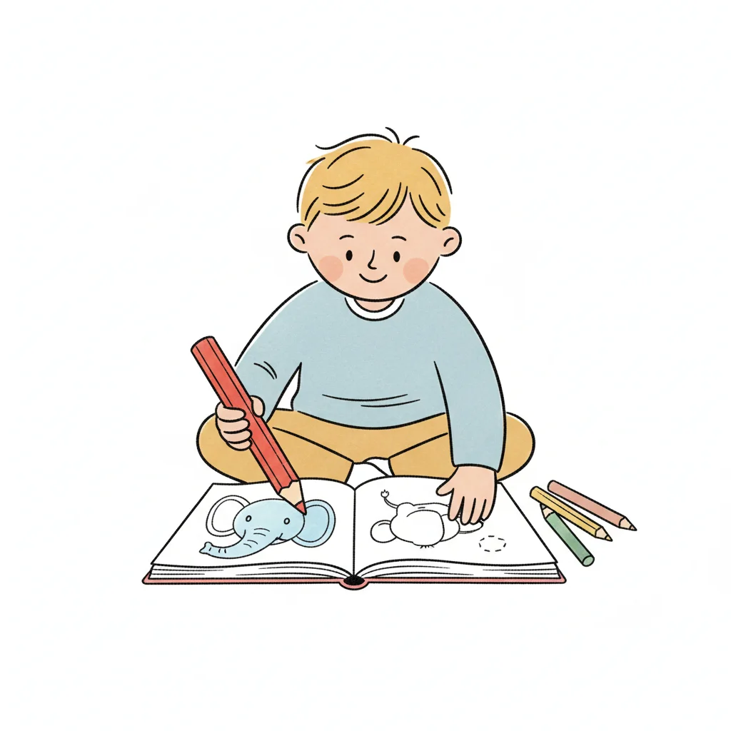 Ein Junge malt in einem Bilderbuch mit Buntstiften.