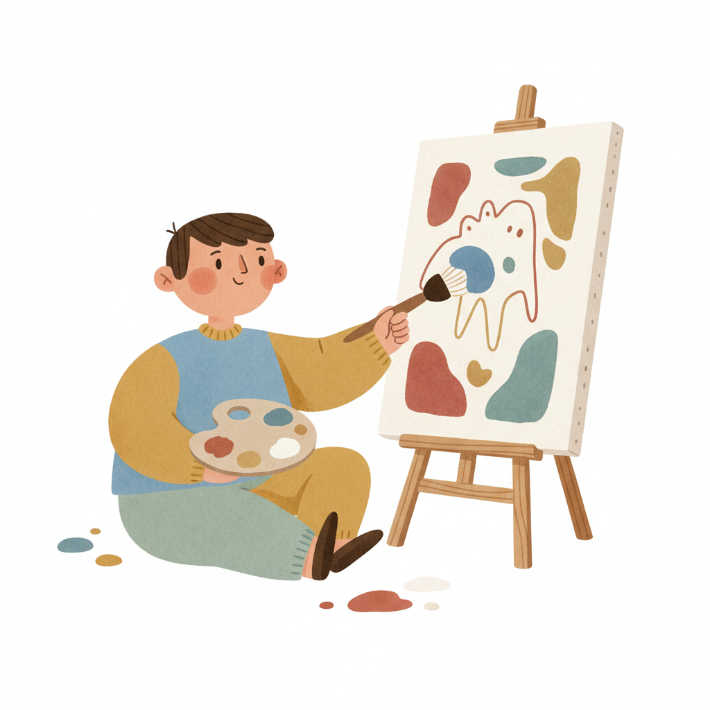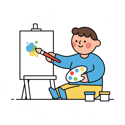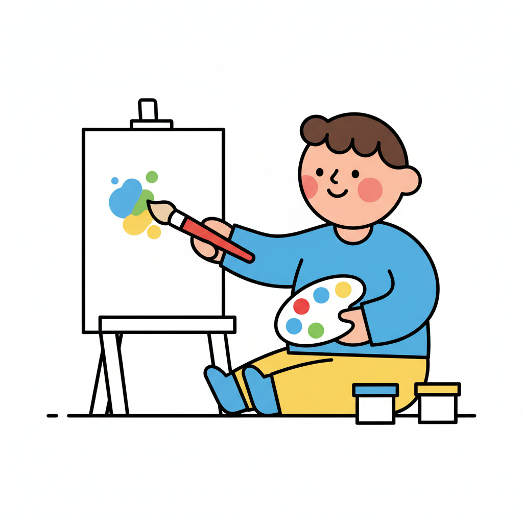 Ein Junge malt fröhlich an einer Leinwand mit bunten Farben.