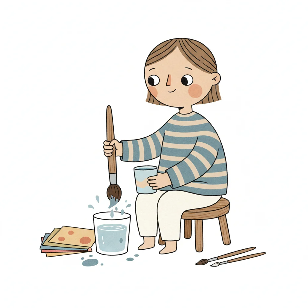 Ein Kind malt mit Wasserfarben und Pinsel auf einem Hocker.