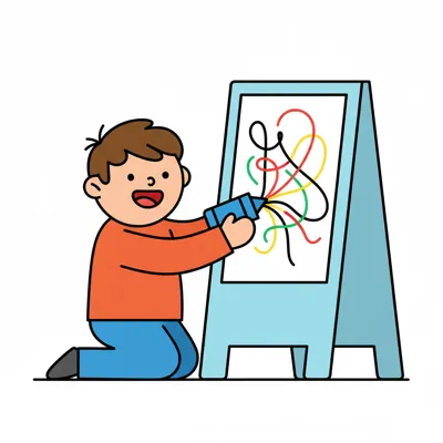 Ein Junge malt fröhlich bunte Linien auf eine Tafel.