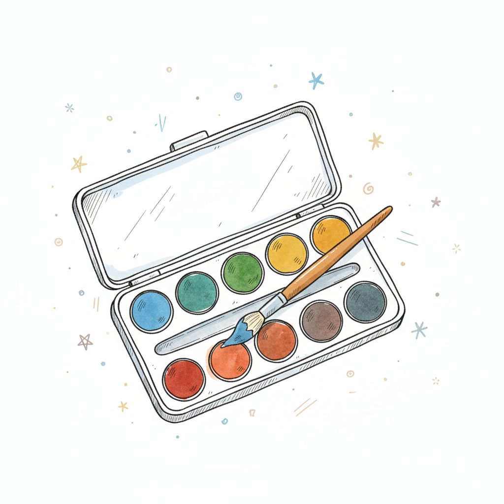 Illustration eines geöffneten Aquarellfarbkastens mit Pinsel und Farbspritzern auf weißem Grund.