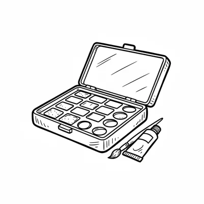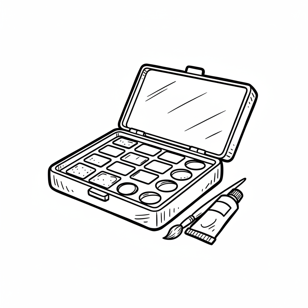Schwarz-weiße Skizze eines geöffneten Aquarellkastens mit Pinsel und Farbtube.