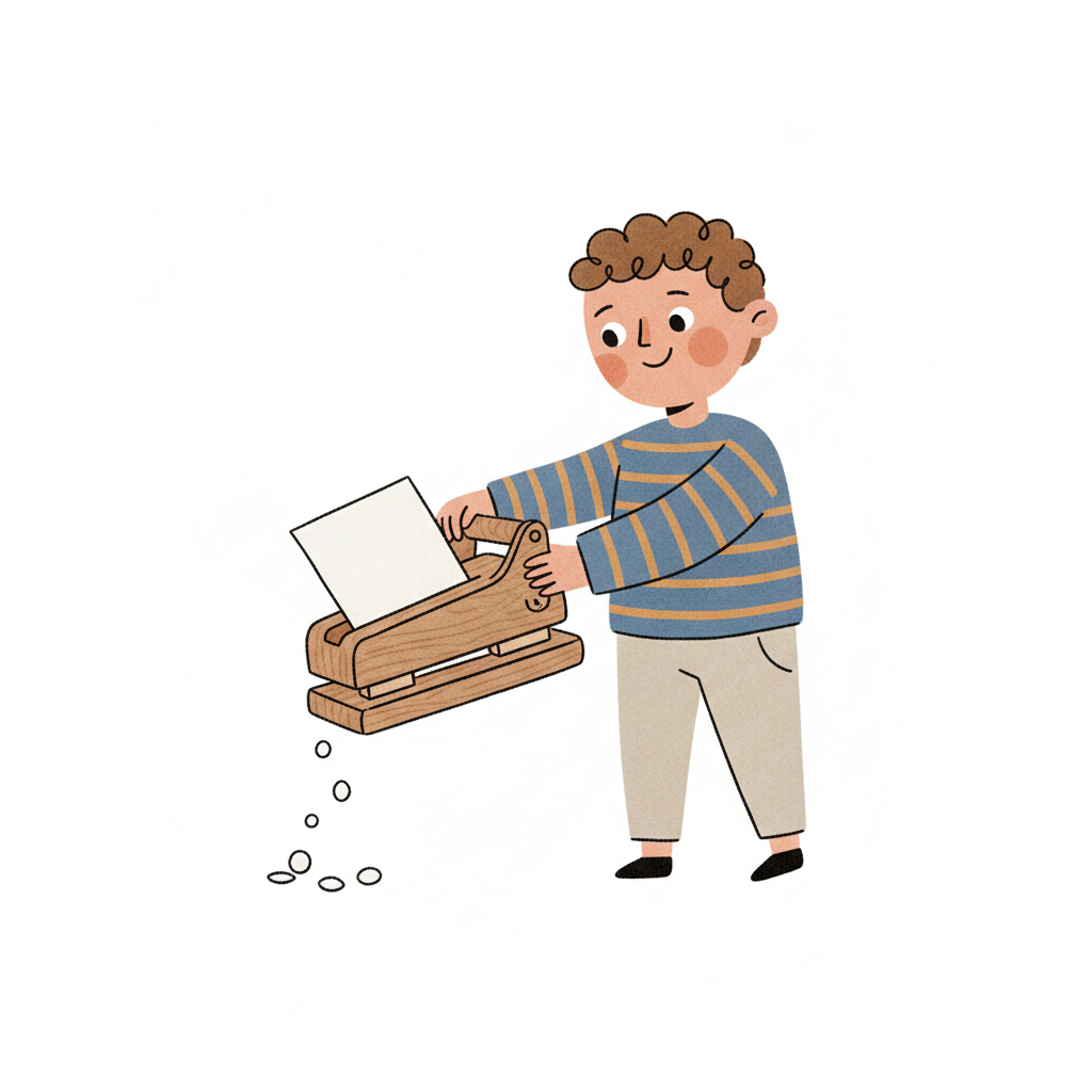 Ein Junge bedient eine Holzmaschine zum Drucken von Papier.