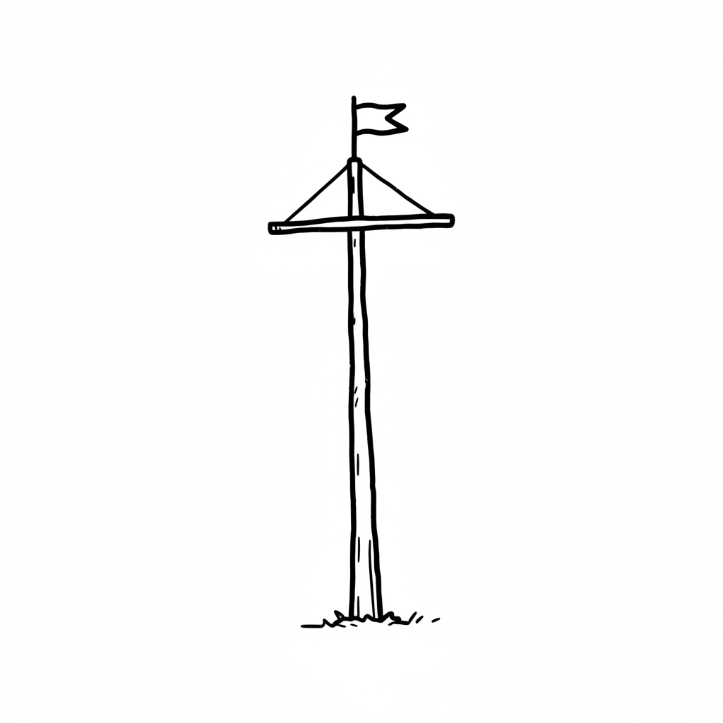 Schwarz-weiße Skizze eines Maibaums mit Fahne und Plattform.