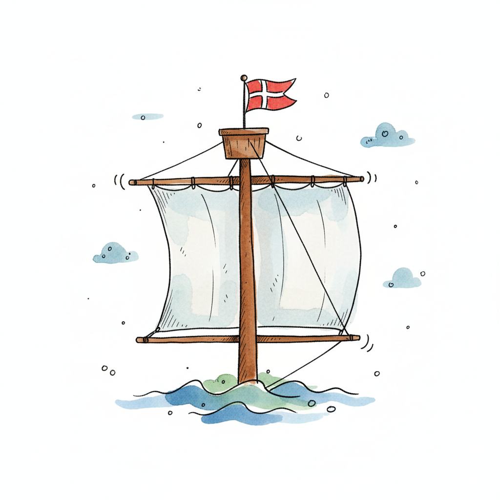 Aquarell-Illustration eines Segelmastes mit dänischer Flagge auf bewegtem Wasser.