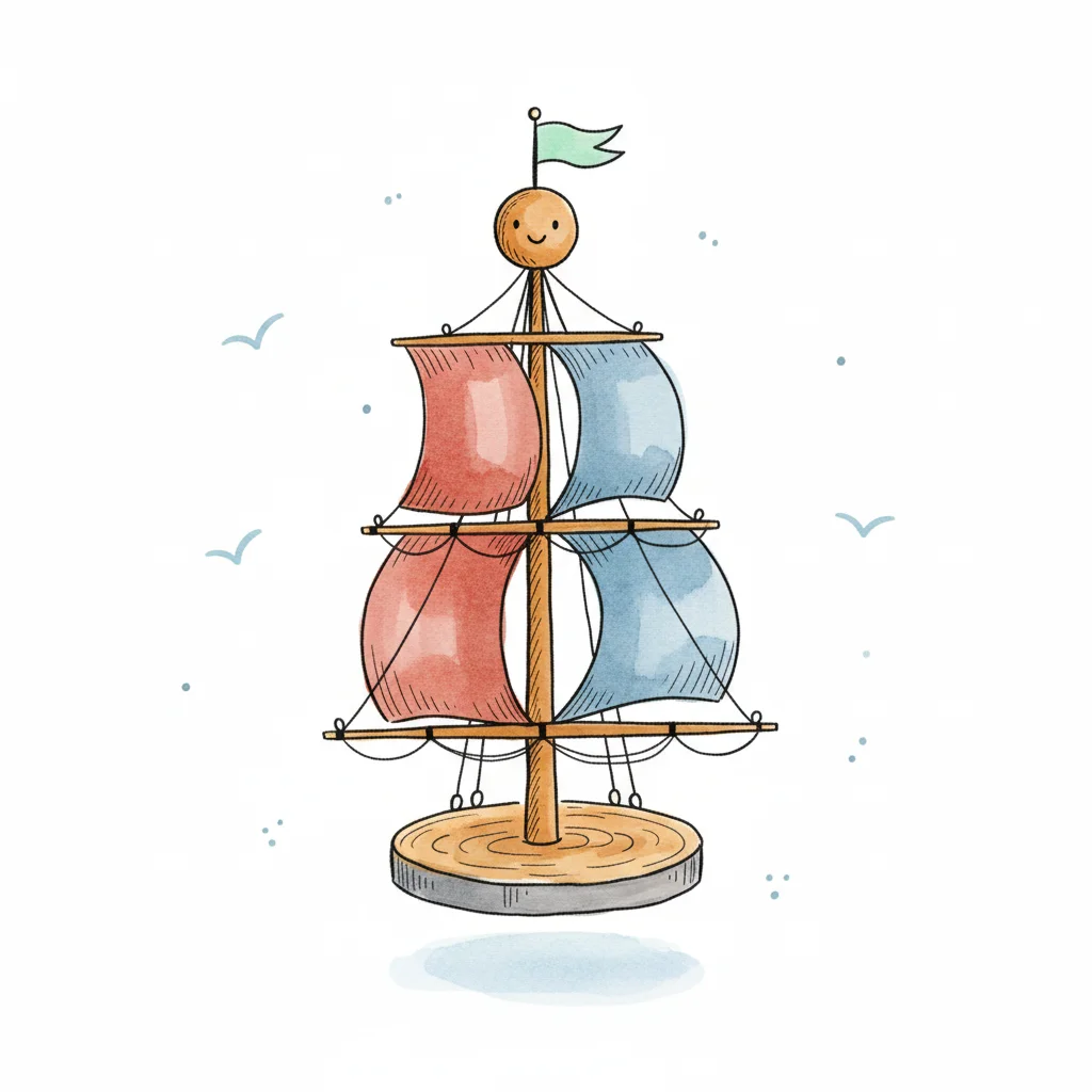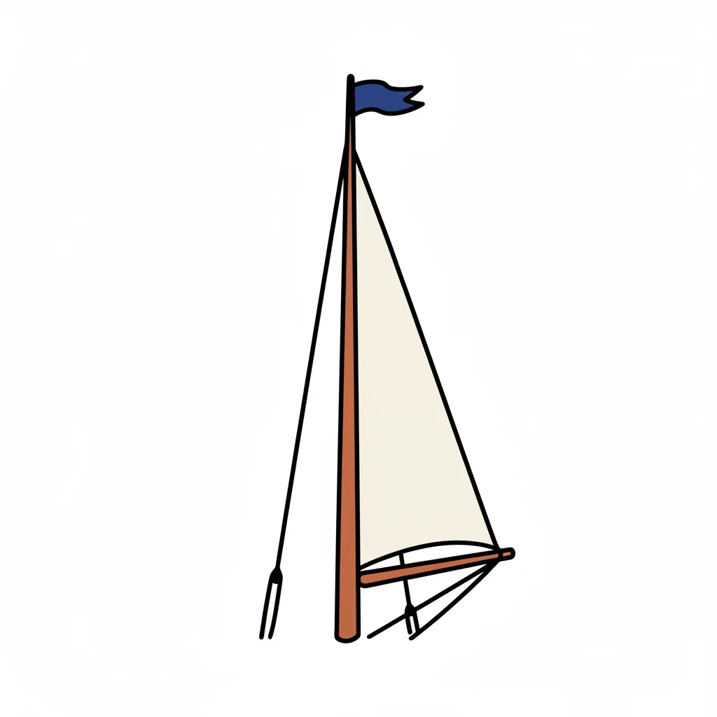 Einfache Illustration eines Segelboots mit braunem Mast, beigem Segel und blauer Flagge.