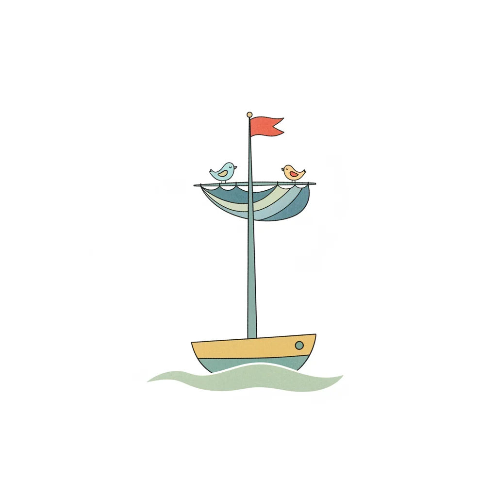 Niedliche Illustration eines Segelboots mit zwei Vögeln auf dem Mast und einer roten Flagge.
