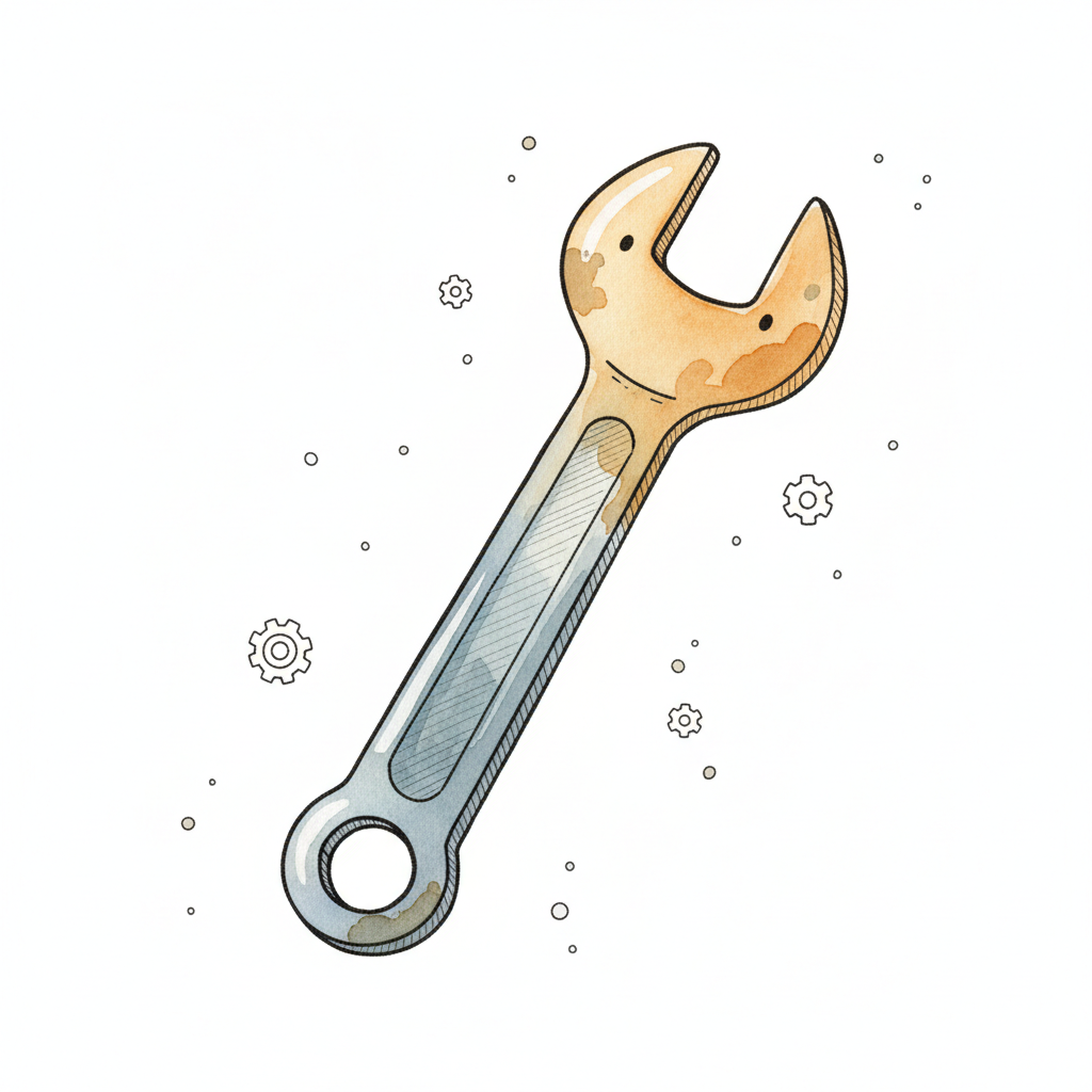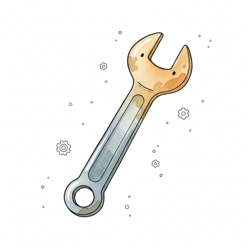 Ein verchromter Schraubenschlüssel mit Zahnrädern im Hintergrund.
