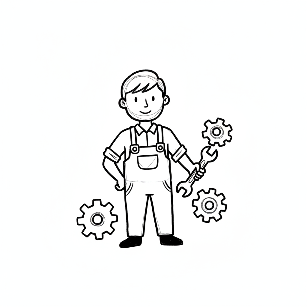 Ein Mechaniker mit Werkzeug, Daumen hoch und Zahnrädern im Hintergrund.