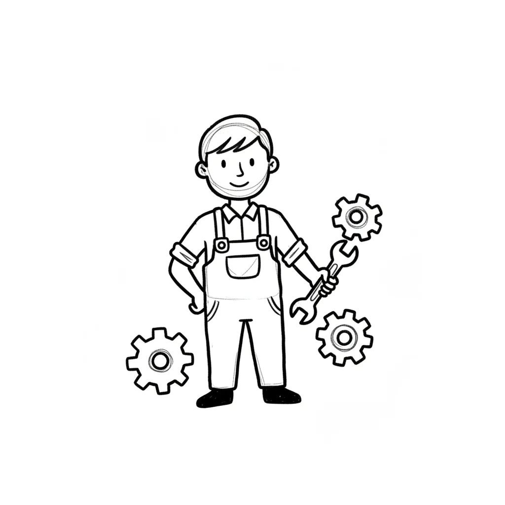 Junger Mechaniker mit Schraubenschlüssel und Zahnrädern.