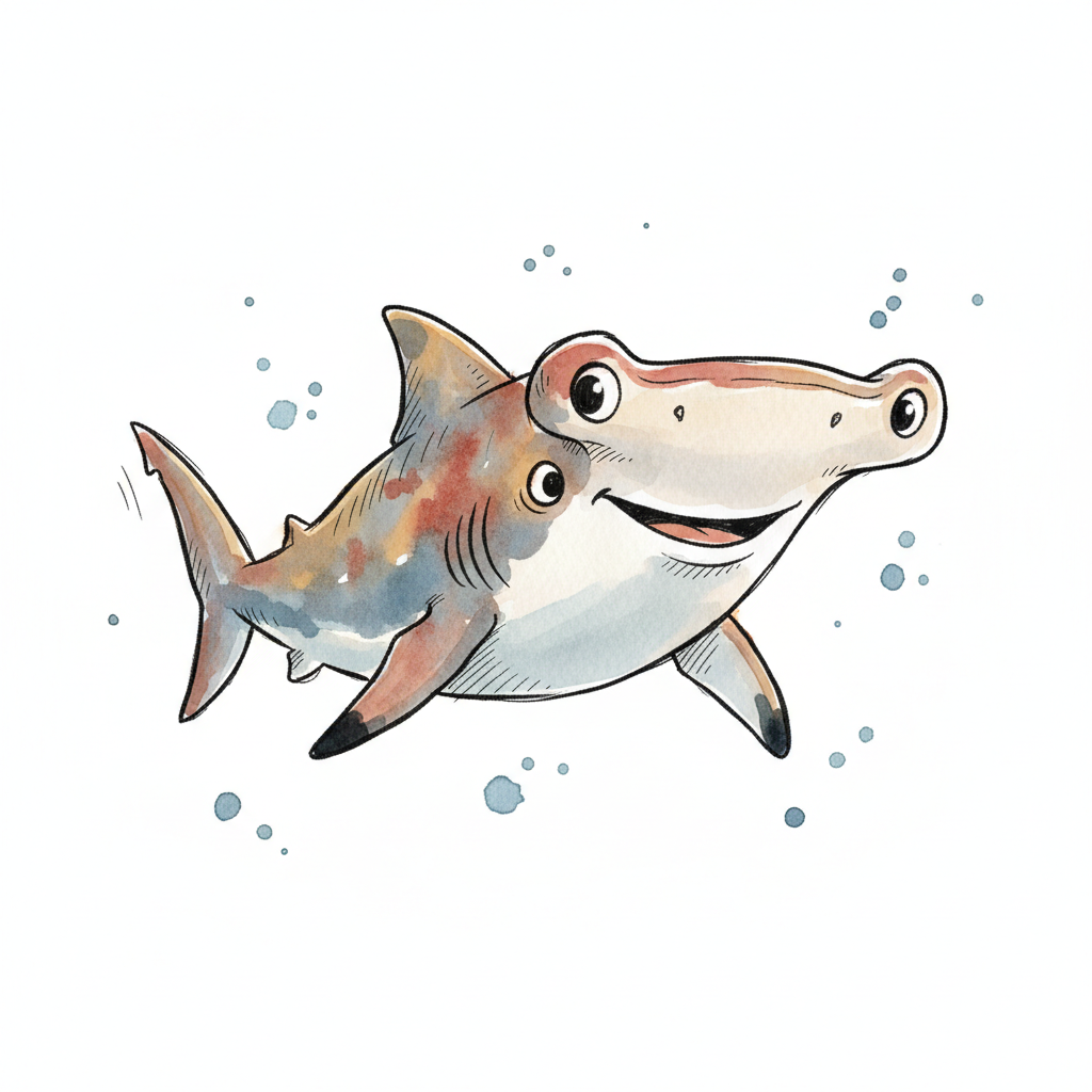 Ein fröhlicher Hammerhaifisch schwimmt mit lächelndem Gesicht.