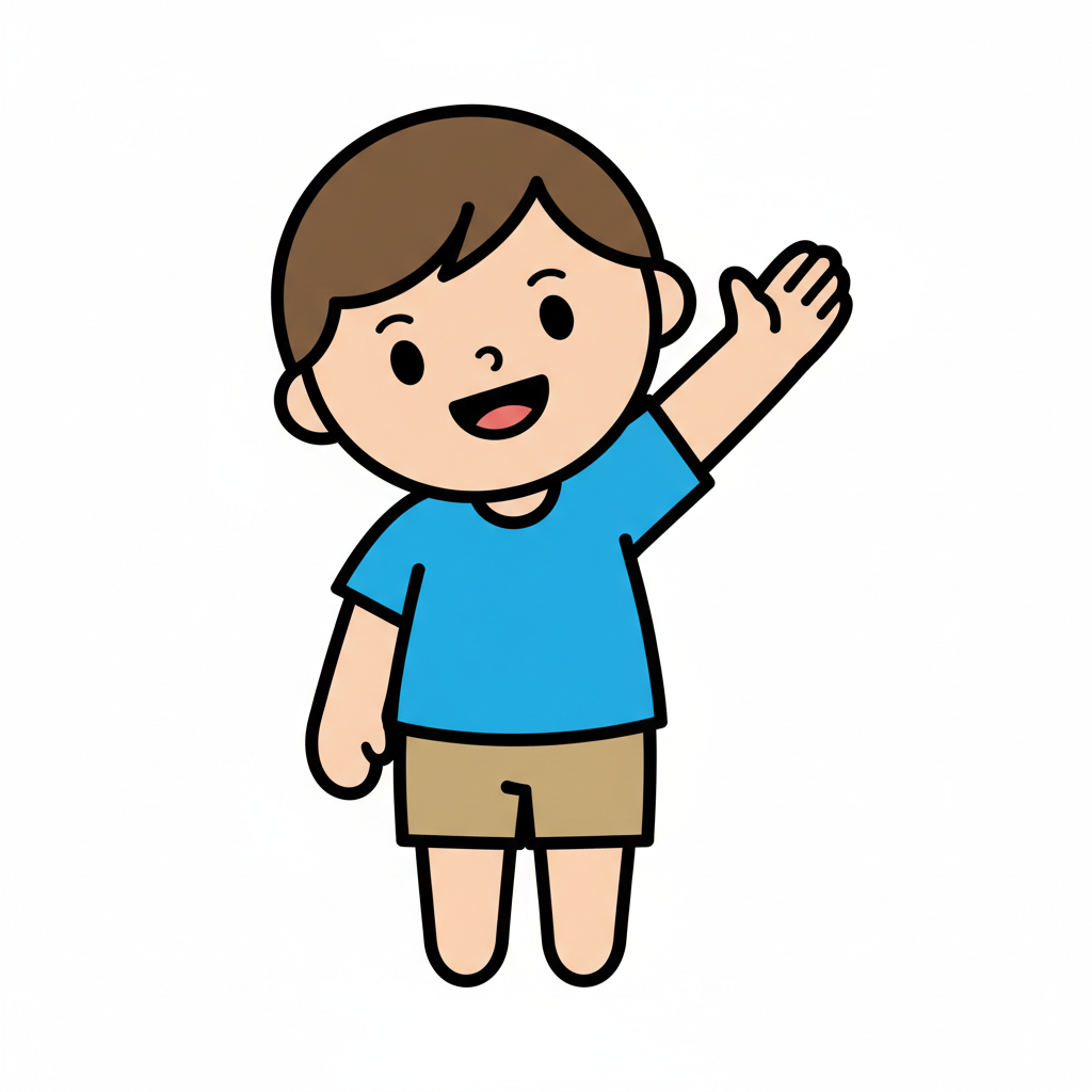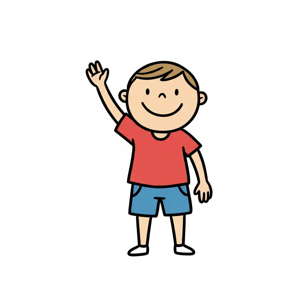 Ein lächelnder Cartoon-Junge in blauem Shirt und beiger Hose winkt fröhlich.