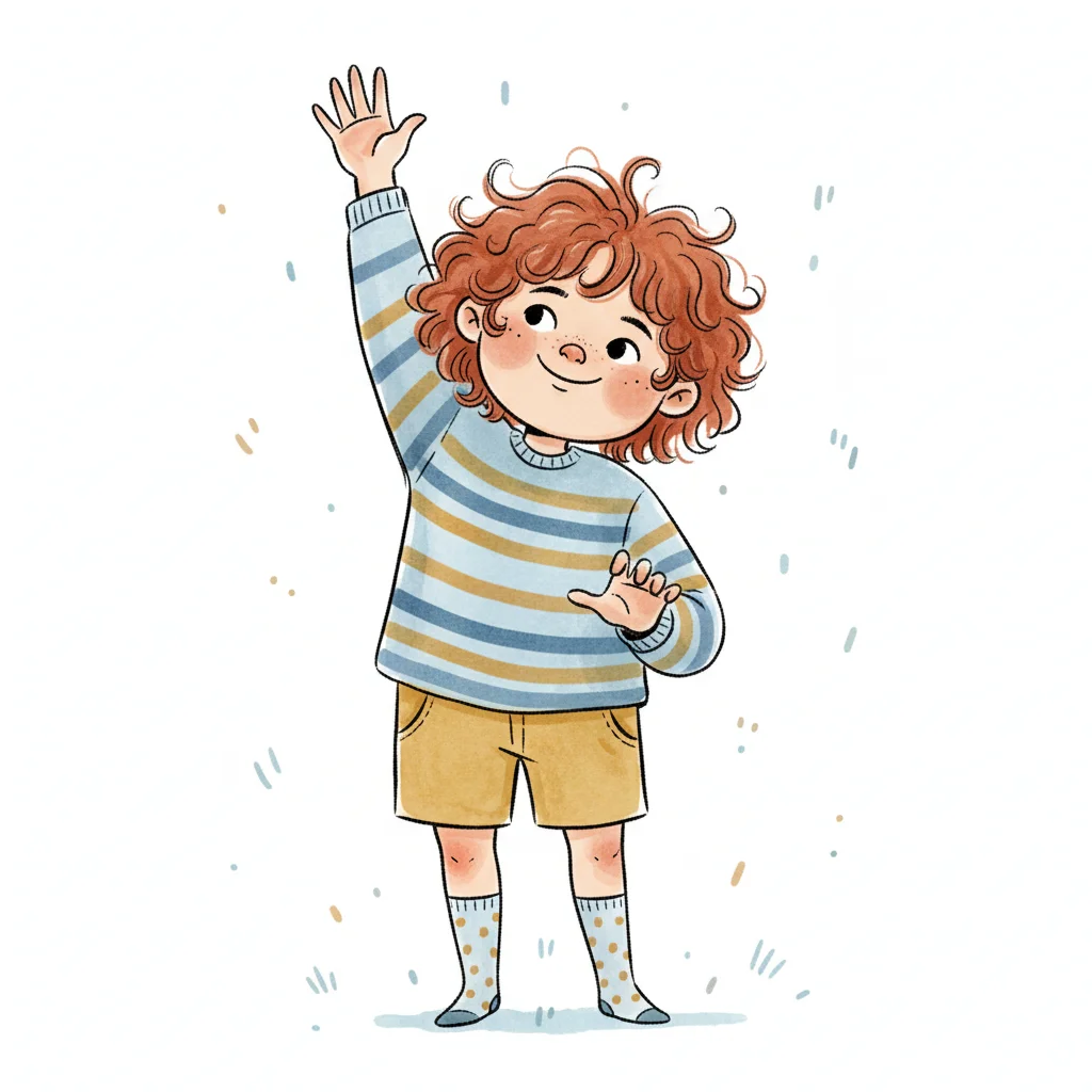 Fröhliches Cartoon-Kind mit roten Locken winkt. Es trägt ein gestreiftes Shirt und gelbe Shorts.