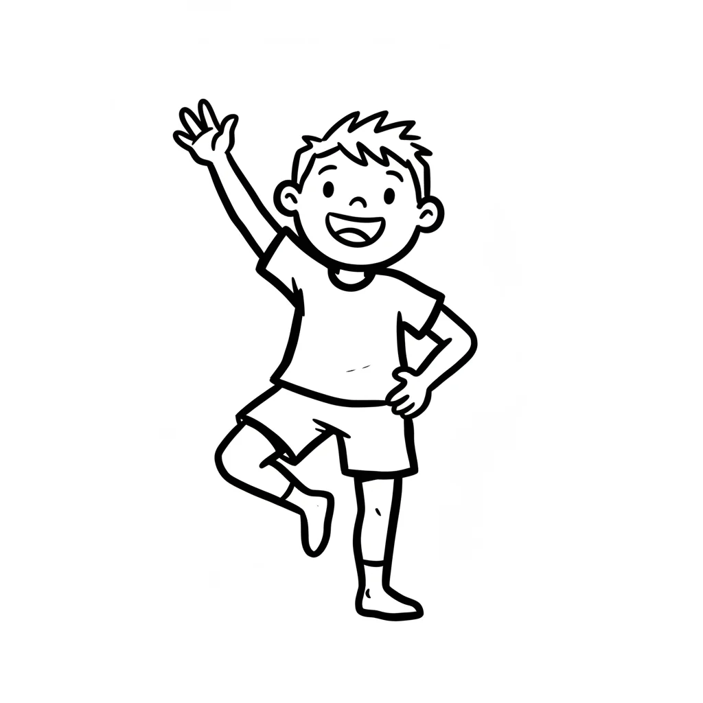 Schwarz-weiße Strichzeichnung eines lächelnden Jungen, der winkt und auf einem Bein steht.