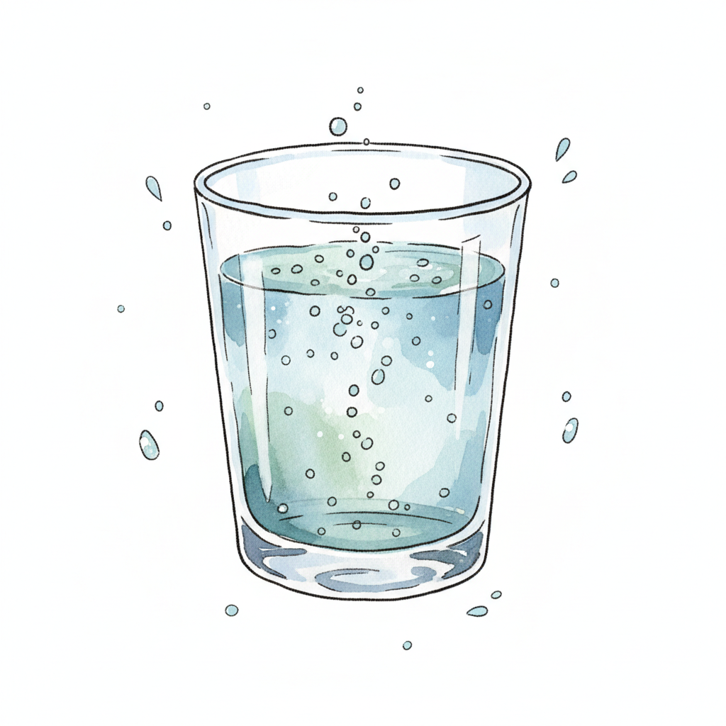Ein Glas Wasser mit sprudelnden Blasen.