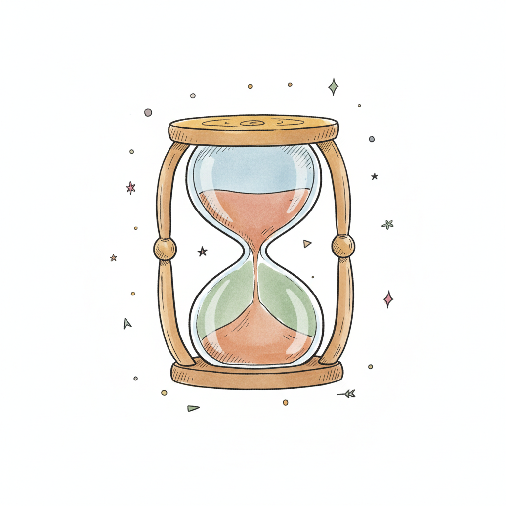 Illustrierte Sanduhr mit orange-grünem Sand und umgebenden Sternen, symbolisiert Zeit.
