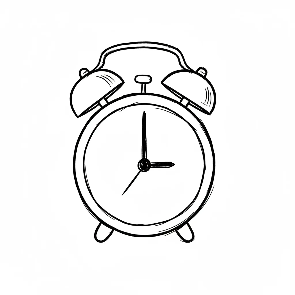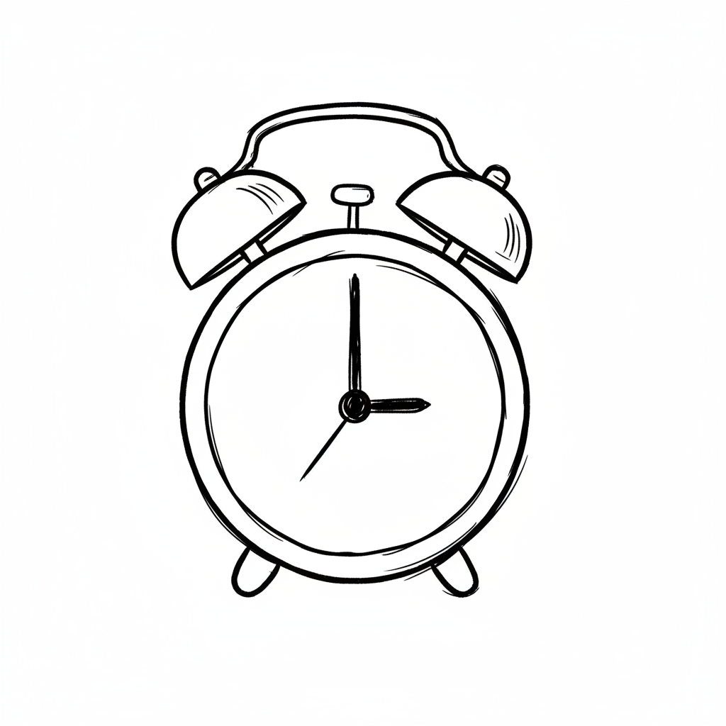 Schwarz-weiße Skizze eines klassischen Weckers mit zwei Glocken und Zeigern auf drei Uhr.