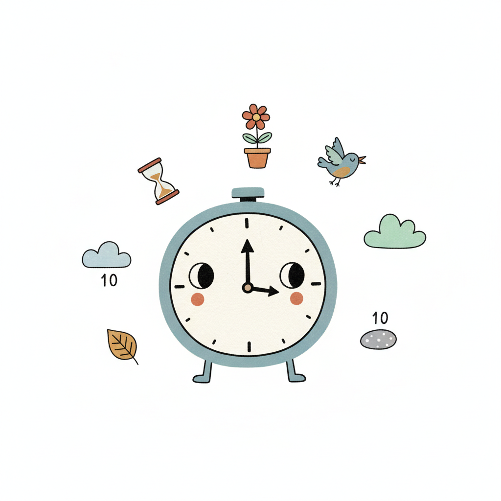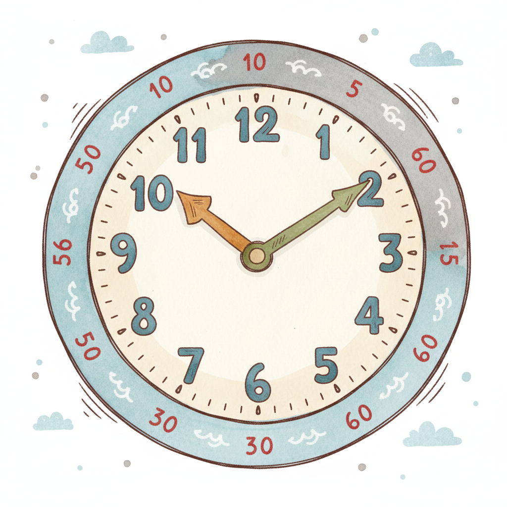 Eine bunte, handgezeichnete Uhr im Cartoon-Stil zeigt 10 Uhr 10 Minuten an. Hellblau und Creme.