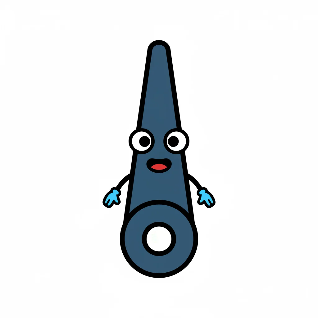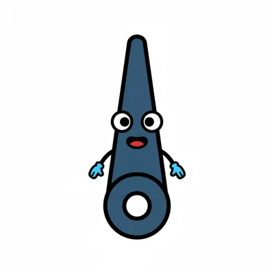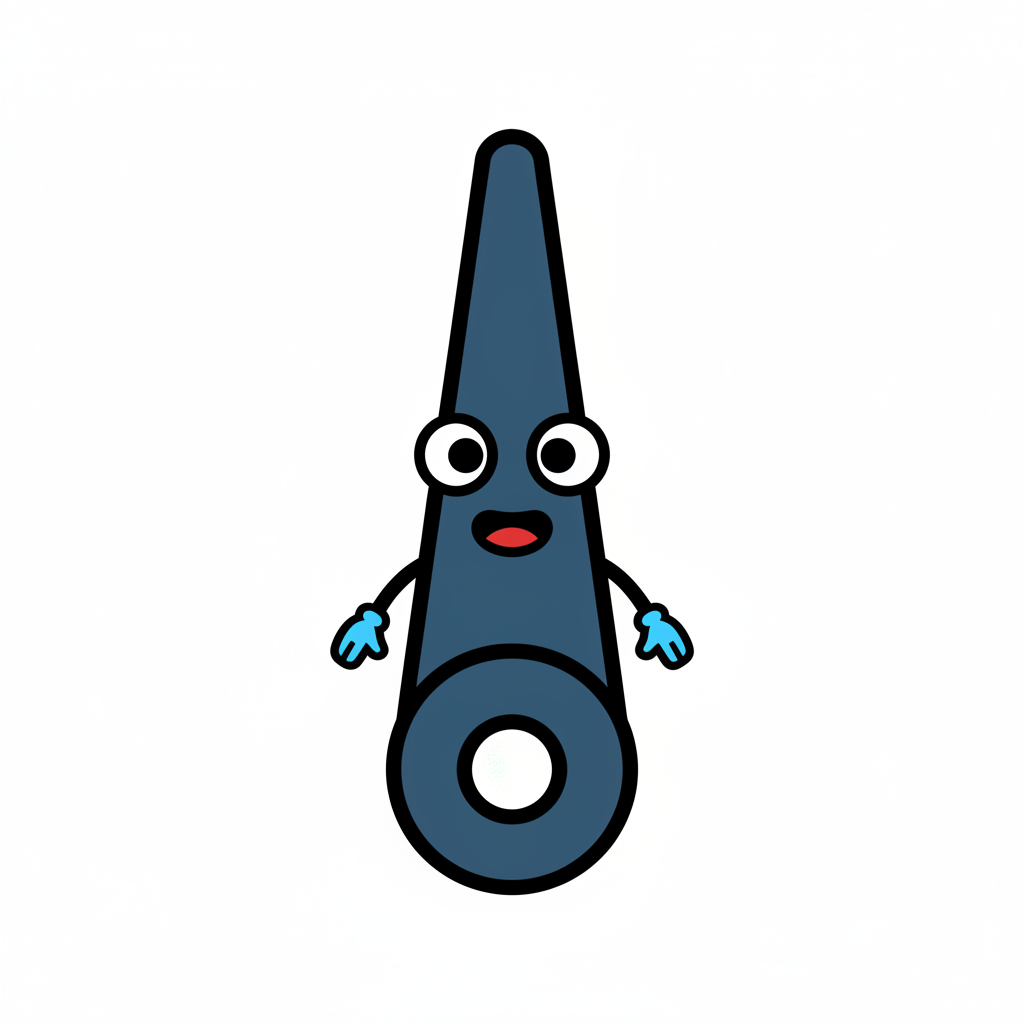 Ein lustiger, blauer Zeiger-Cartoon-Charakter mit Augen, Mund und Armen auf weißem Hintergrund.