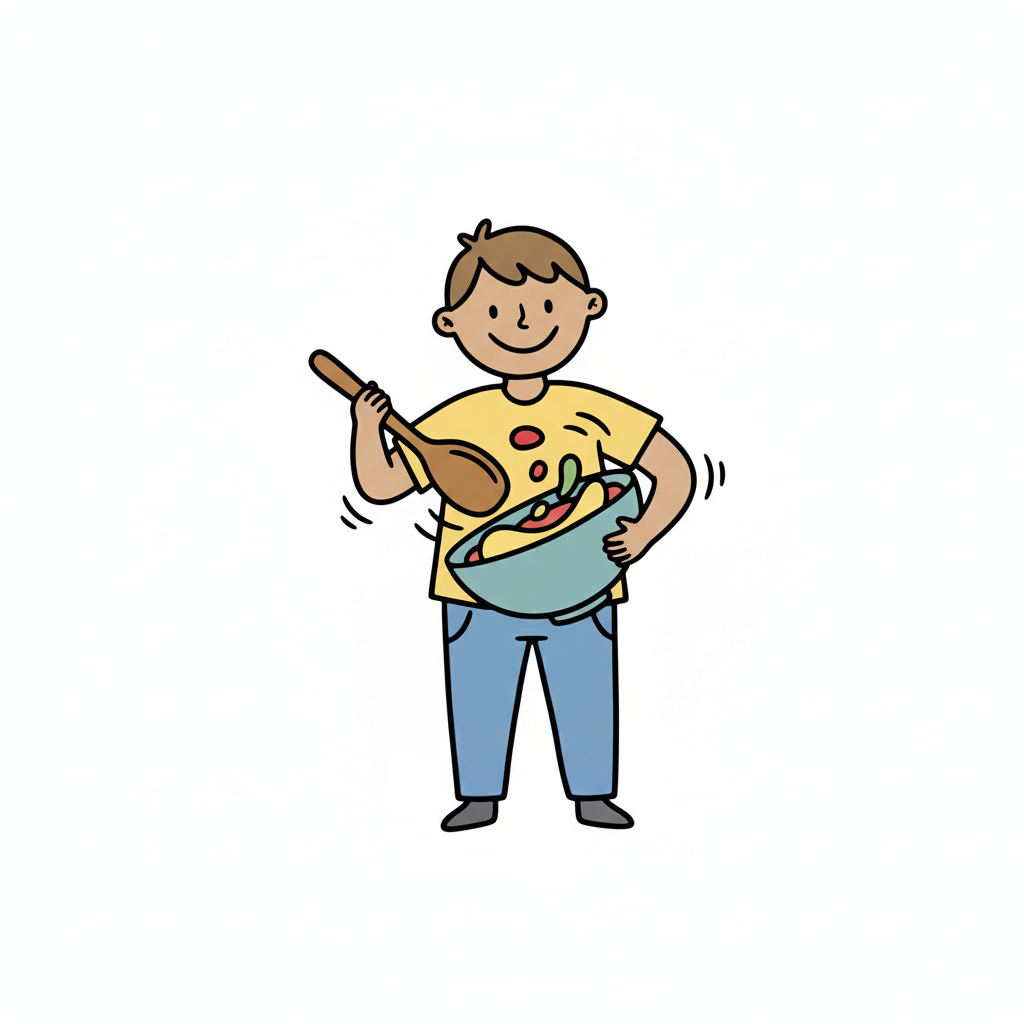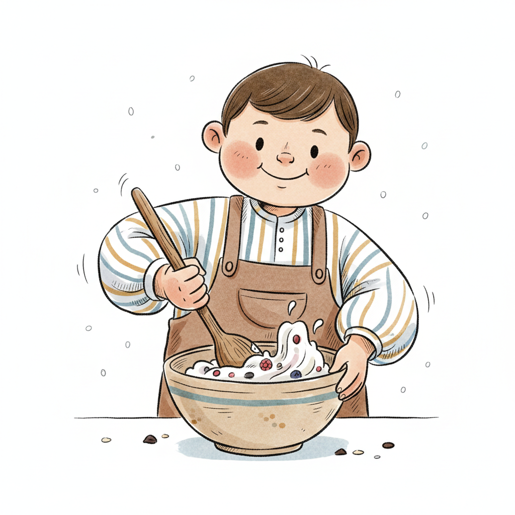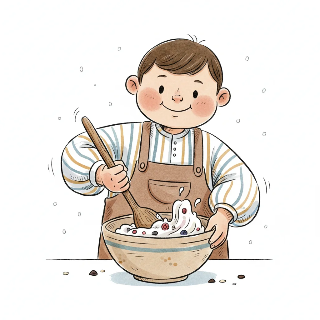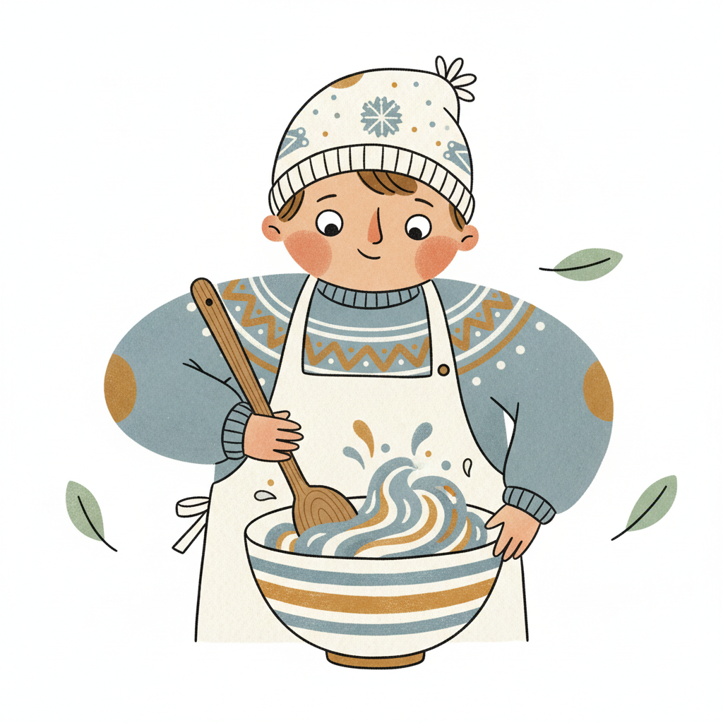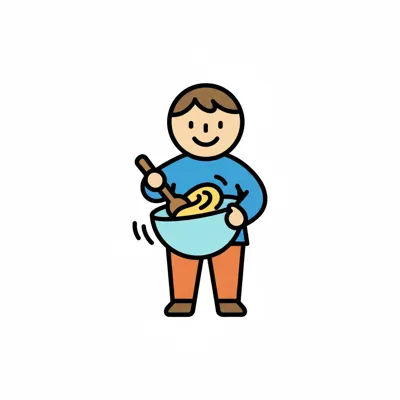 Lächelnde Cartoonfigur rührt Teig in einer blauen Schüssel mit einem Holzlöffel.