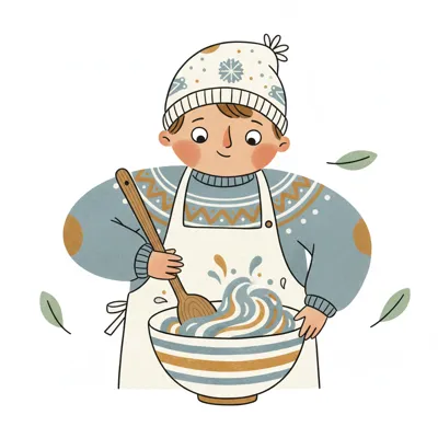 Fröhliches Kind in Winterkleidung rührt Teig in einer Schüssel. Gemütliche Backszene.