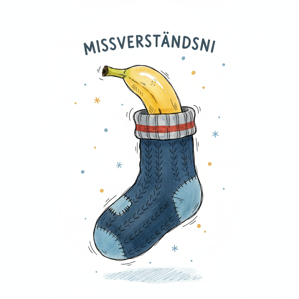 Lustige Illustration: Eine Banane steckt in einer blauen Socke. Darüber steht 'MISSVERSTÄNDNIS'.