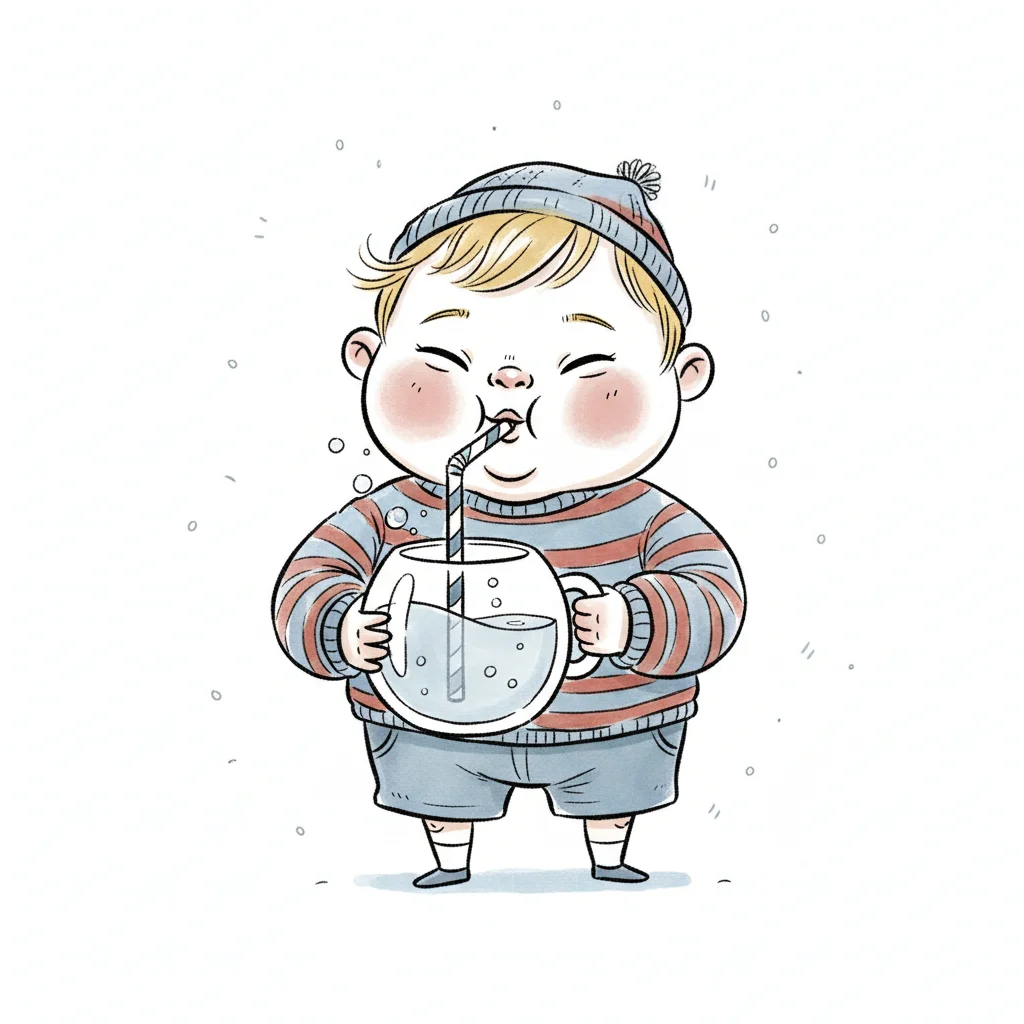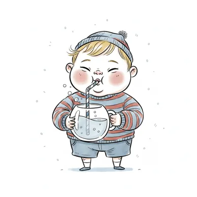 Ein fröhlicher Junge trinkt aus einer Glasflasche mit einem Strohhalm.
