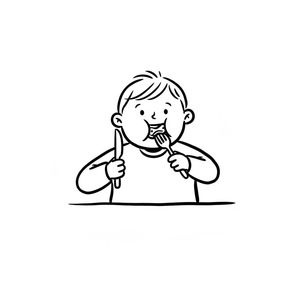 Junge isst mit Messer und Gabel, Freude am Essen.