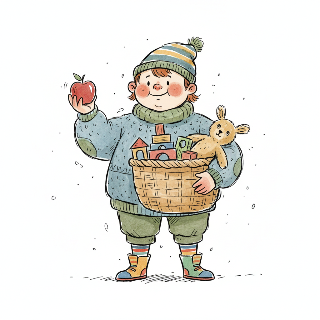 Fröhliches Kind in Winterkleidung hält Apfel und einen Korb mit Holzspielzeug und Teddybär.