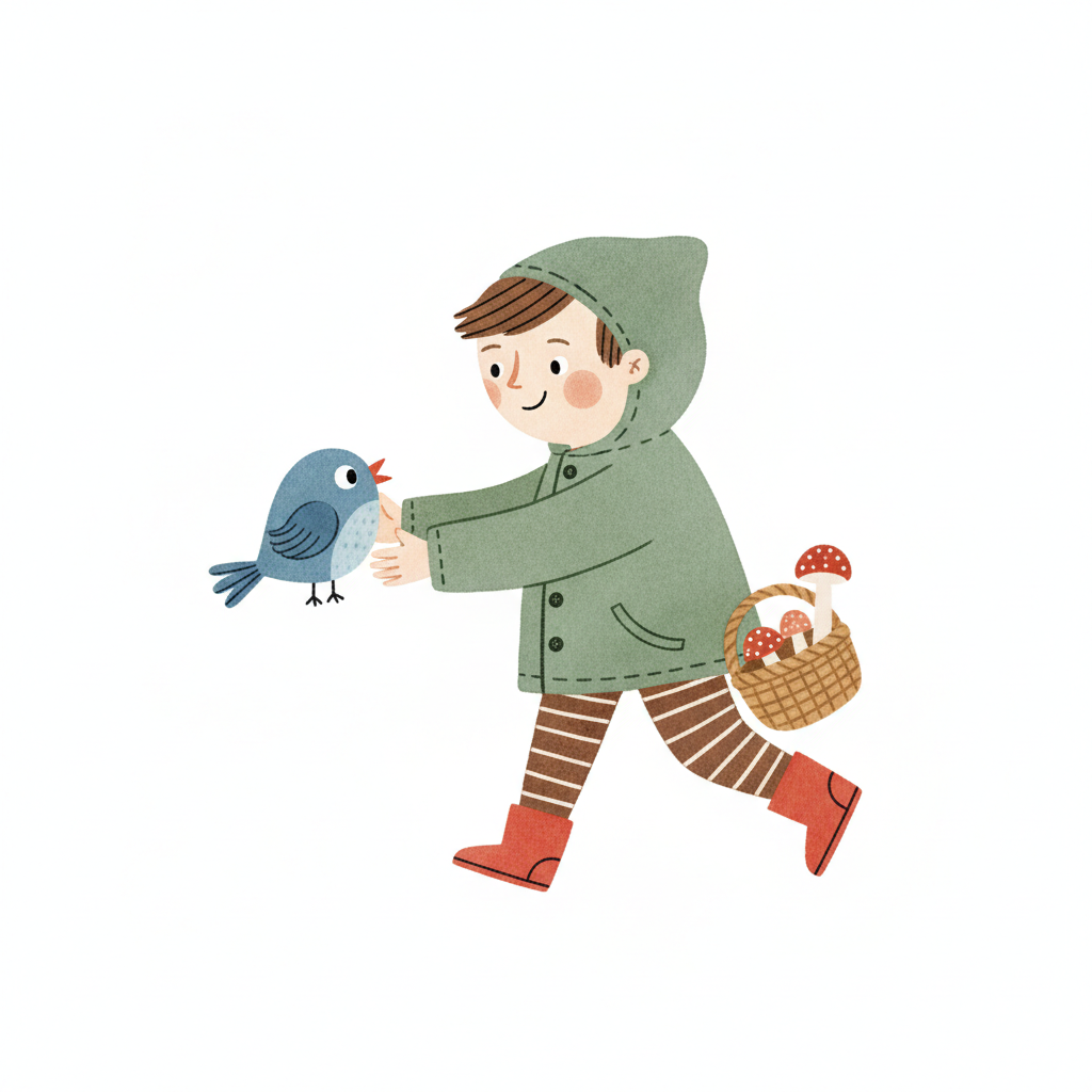Ein Junge in grüner Jacke hält einen Vogel und trägt einen Korb mit Pilzen.