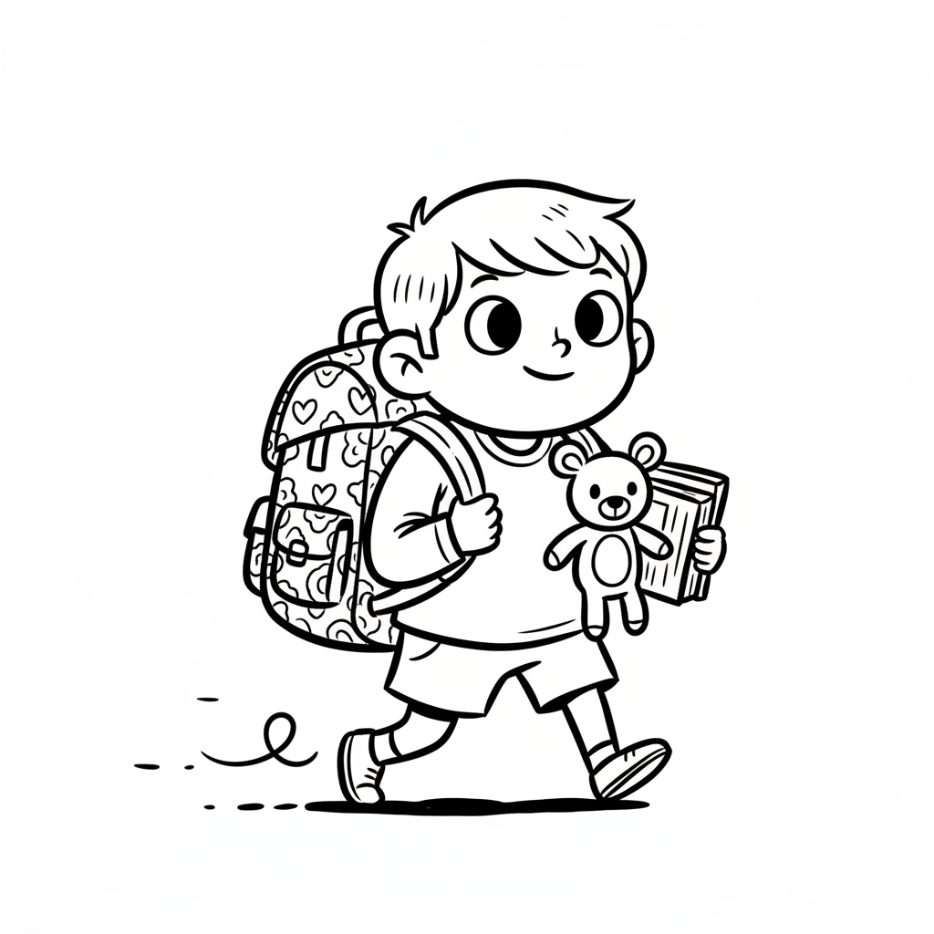 Lächelnder Junge mit Rucksack, Teddybär und Buch geht. Schwarz-weiß-Illustration.