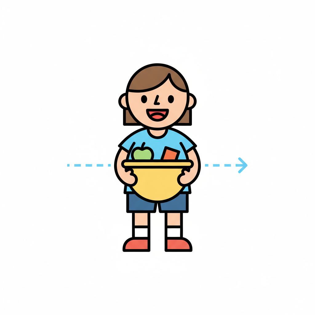 Lachende Cartoonfigur hält Schüssel mit Apfel und Karotte, daneben ein gestrichelter Pfeil.