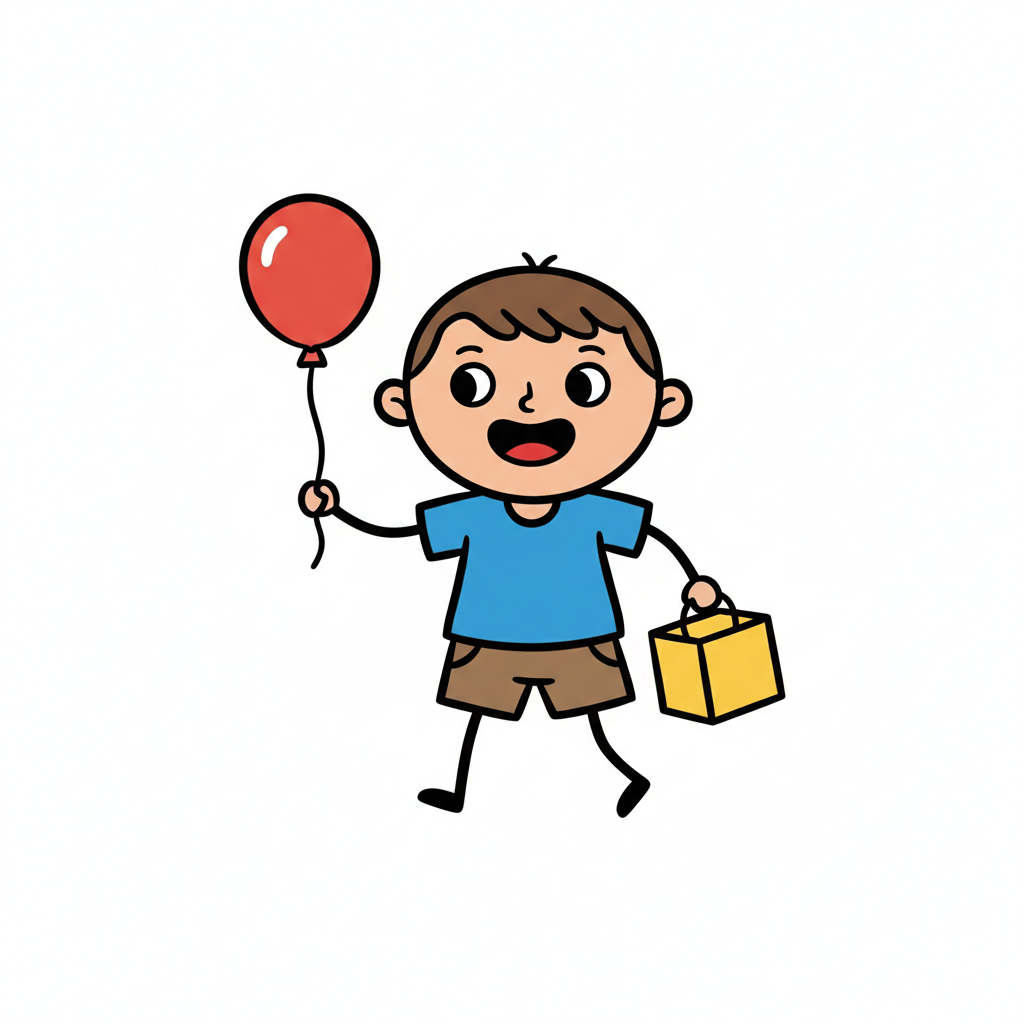 Ein fröhlicher Cartoon-Junge läuft mit einem roten Ballon und einer gelben Geschenktüte.