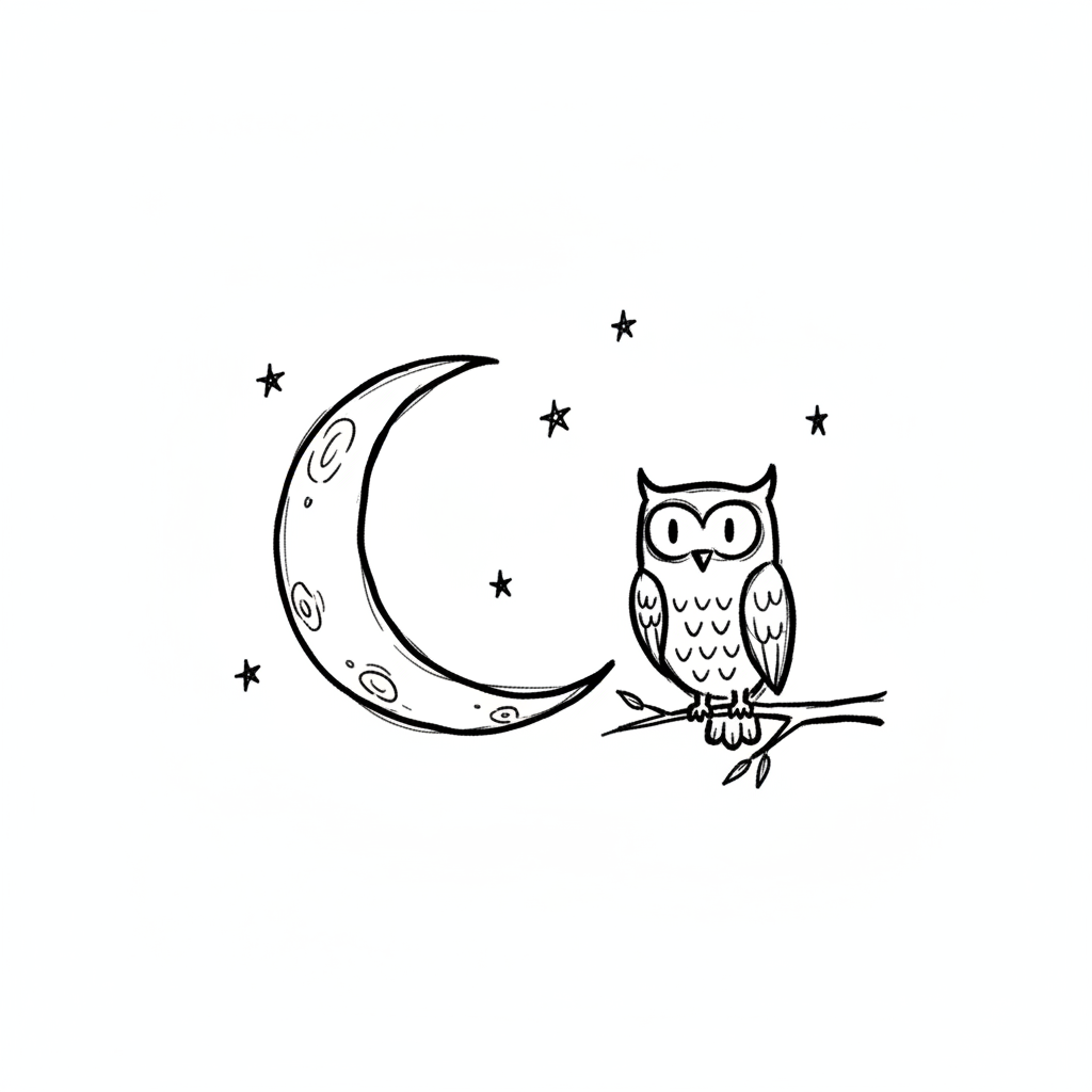 Schwarz-weiße Cartoon-Eule auf Ast neben Mondsichel und Sternen.